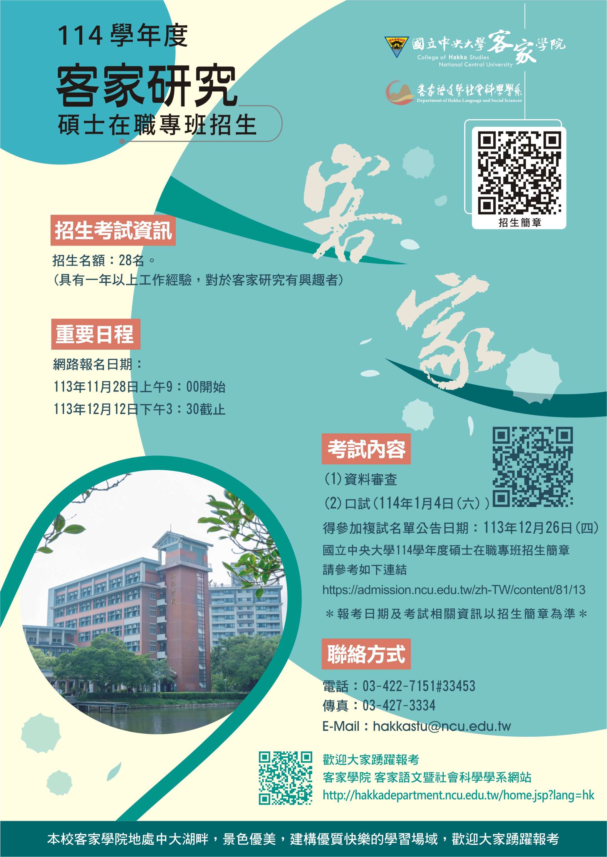 一、本校客家語文暨社會科學學系「客家研究碩士在職專班」 114學年度招生,考試內容為:資料審查(免筆試)及口試,招生海報如附件。