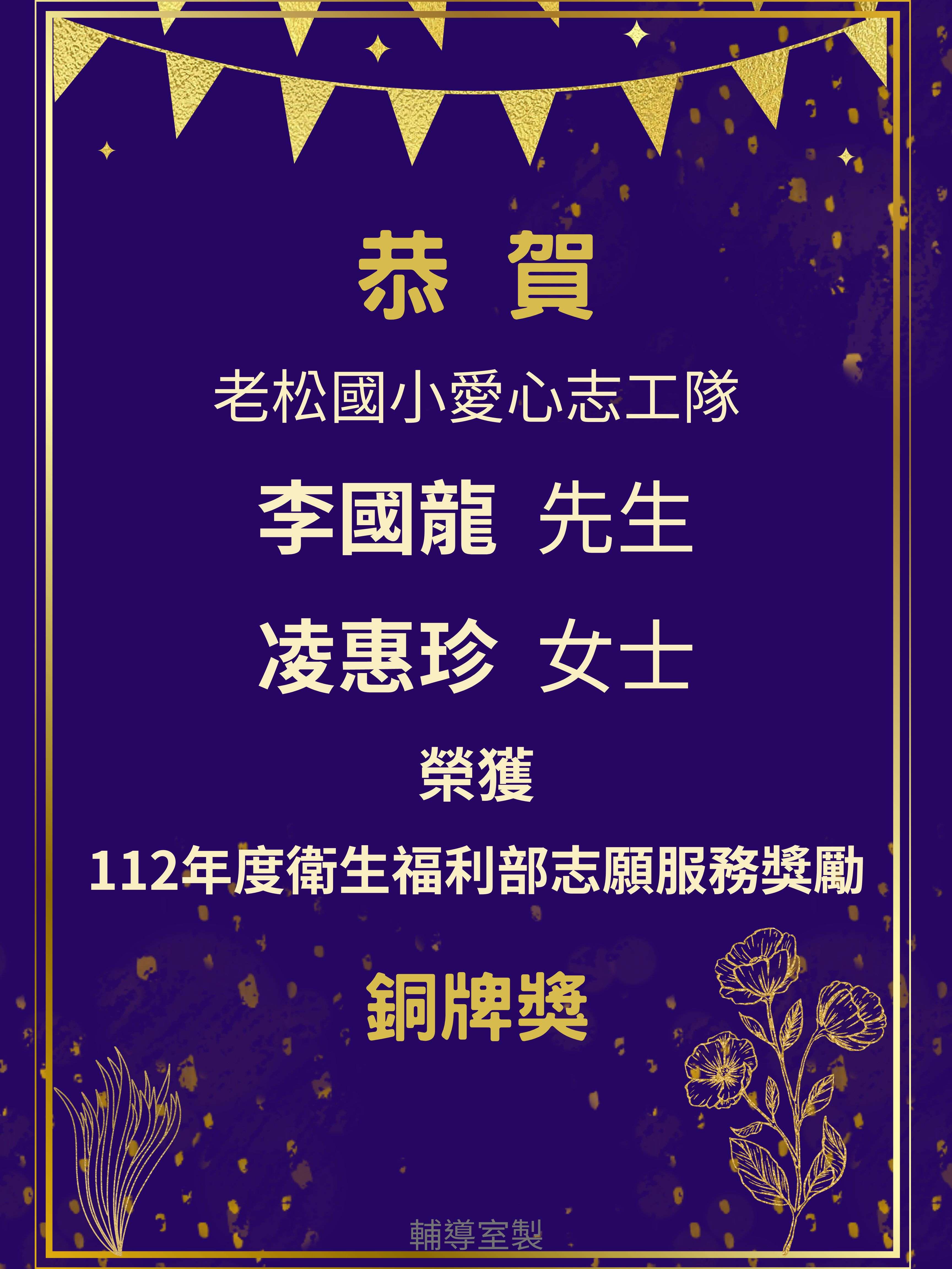 恭喜老松國小愛心志工隊李國龍先生和凌惠珍女士