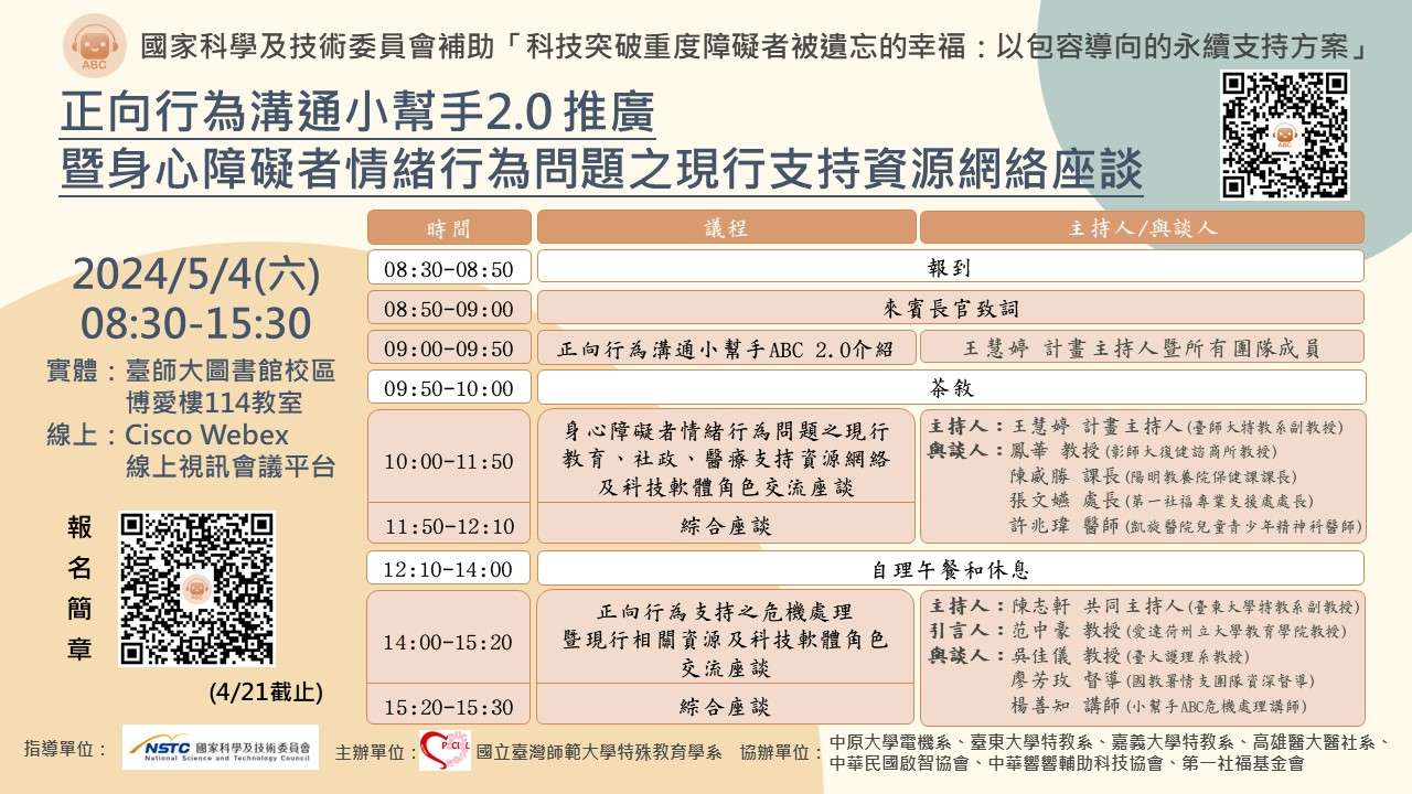 (三)邀請對象:各級普特輔學校教師、教師助理員、教保員、生輔員、居服員、照服員、社工、醫師、護理師、臨床心理師、職能治療師、物理治療師、語言治療師等 支持情緒行為需求和(或)輔助溝通需求的專業人員。