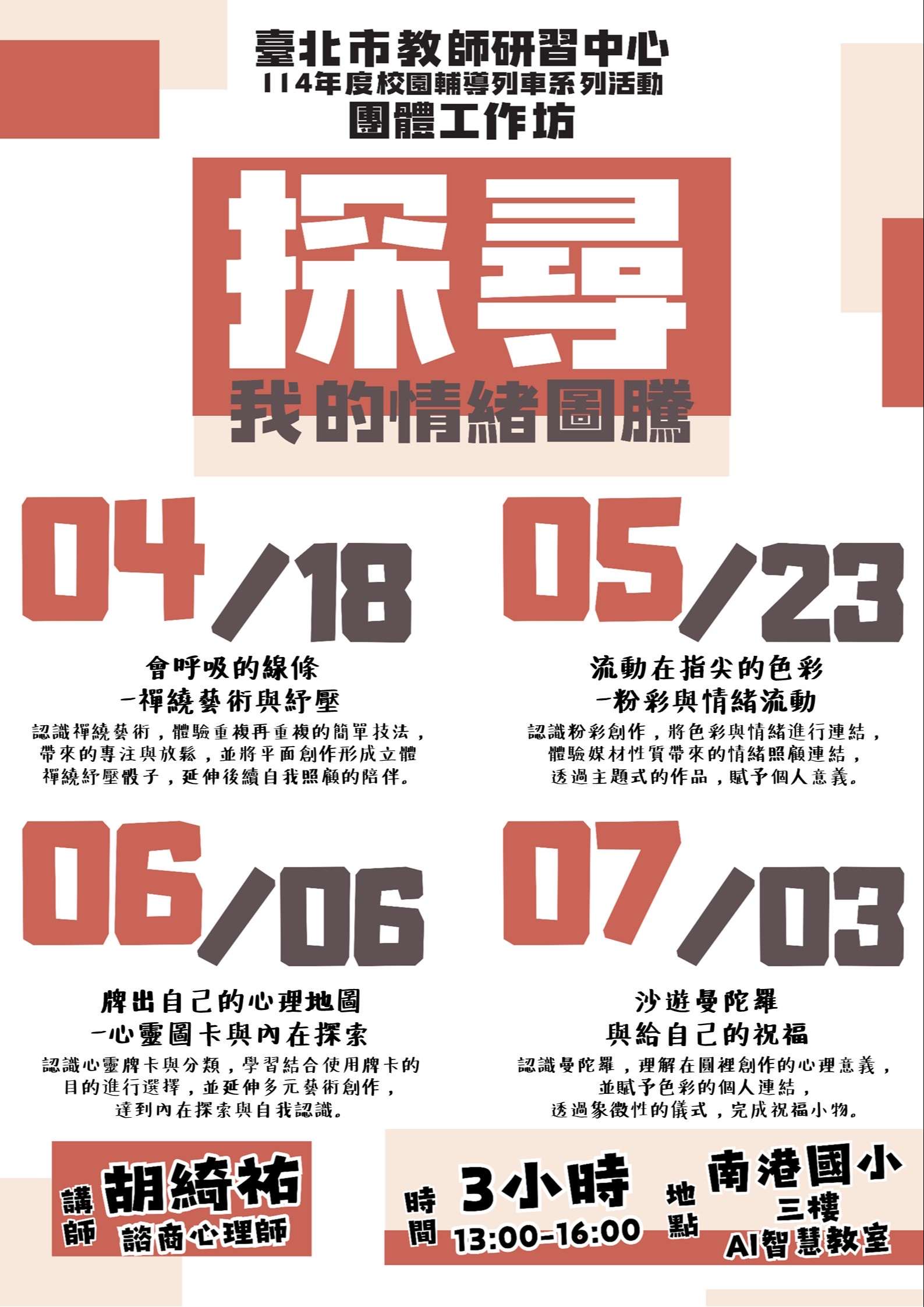 四、倘有研習相關問題,請逕洽南港國小輔導組長高意雯老師,聯絡電話:02-2783-4678轉2402。