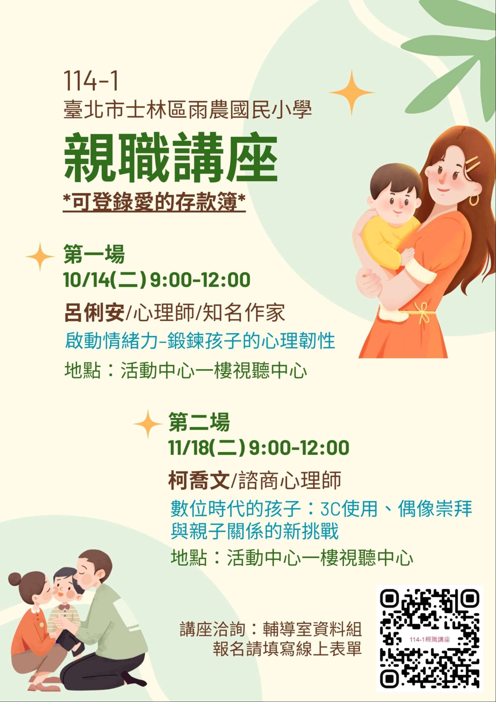 一、本市雨農國小10至11月共計辦理兩場親職講座課程,結合愛的存款簿學習集點活動給予時數。講座課程內容如下: