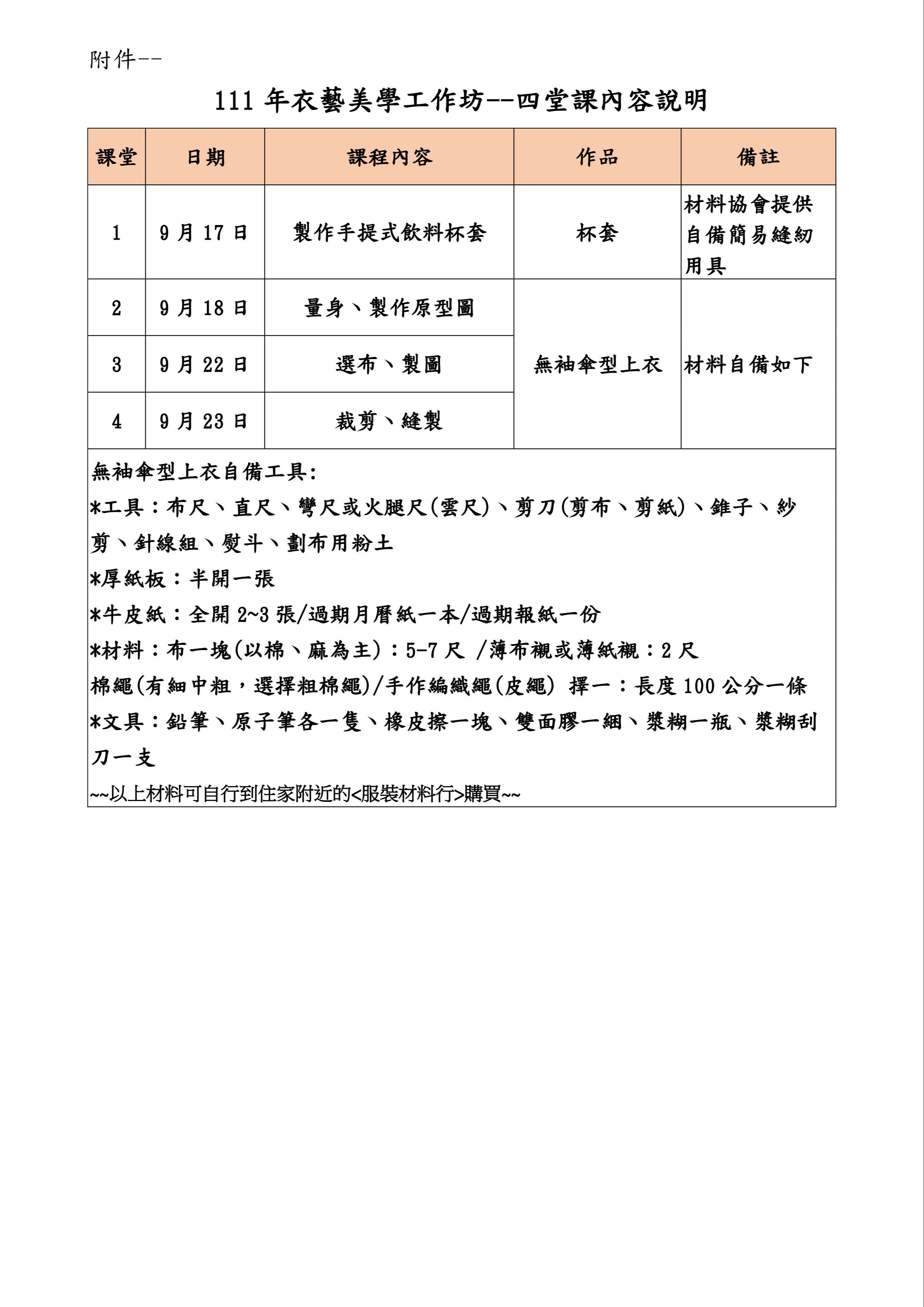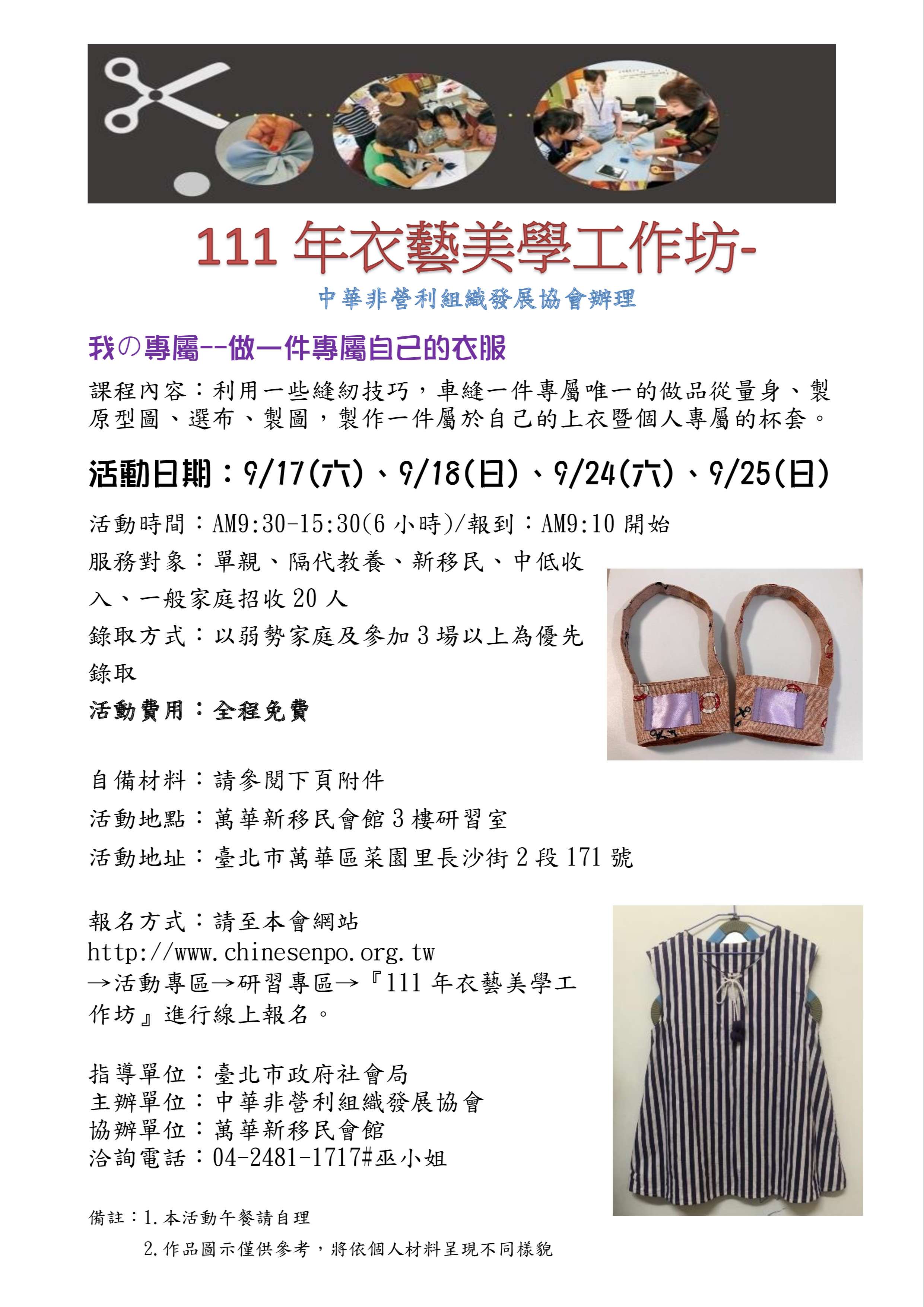 四、報名方式:請至網站www.chinesenpo.org.tw→活動專區→研習專區→『111年度衣藝美學工作坊』進行報名