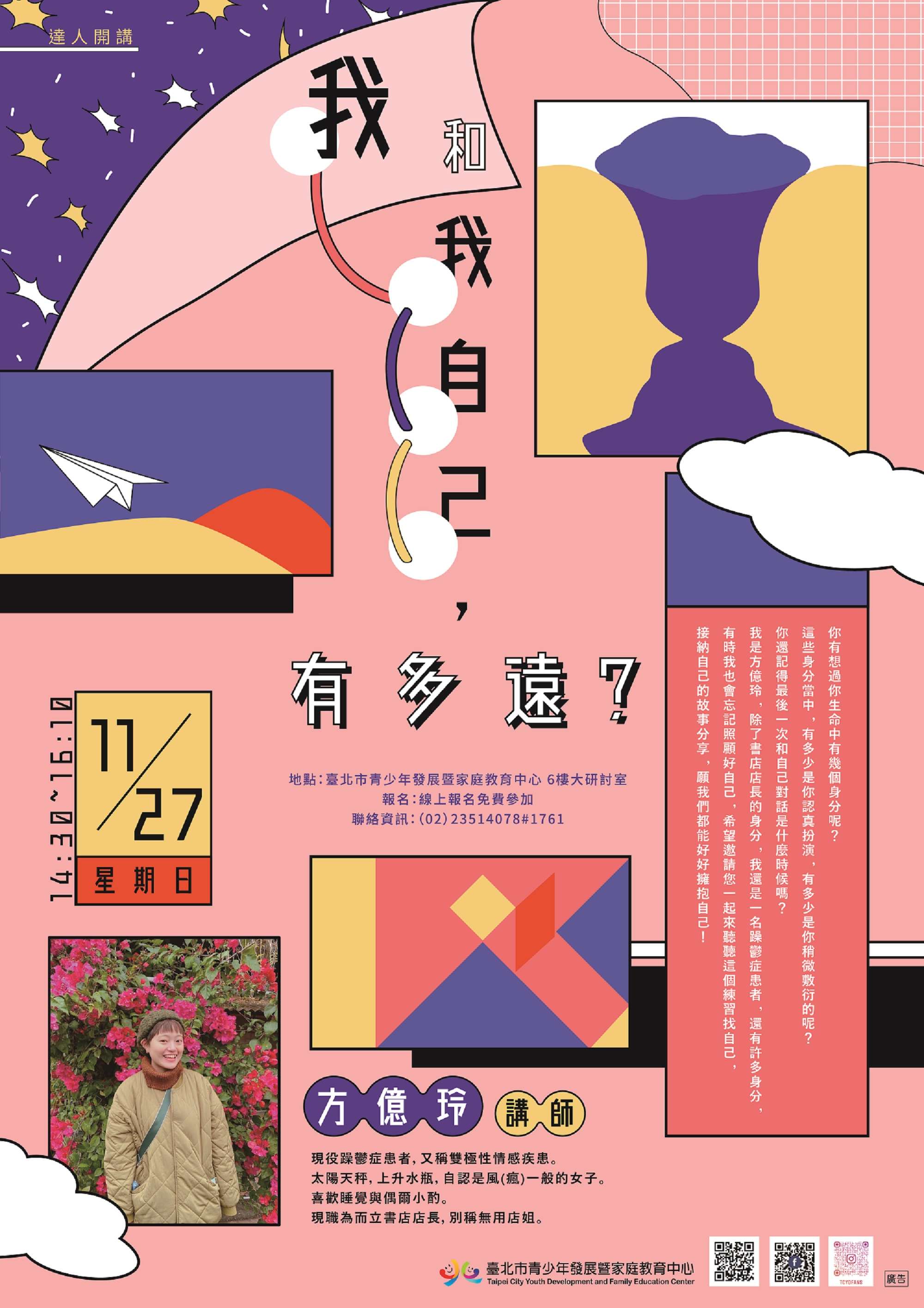 (二)60字:臺北市青少年發展暨家庭教育中心11月27日14:30舉辦達人開講:我和我自己,有多遠?。方億玲與您分享閱讀的意義,以及過程中的體驗;活動免費詳見青發中心官網。