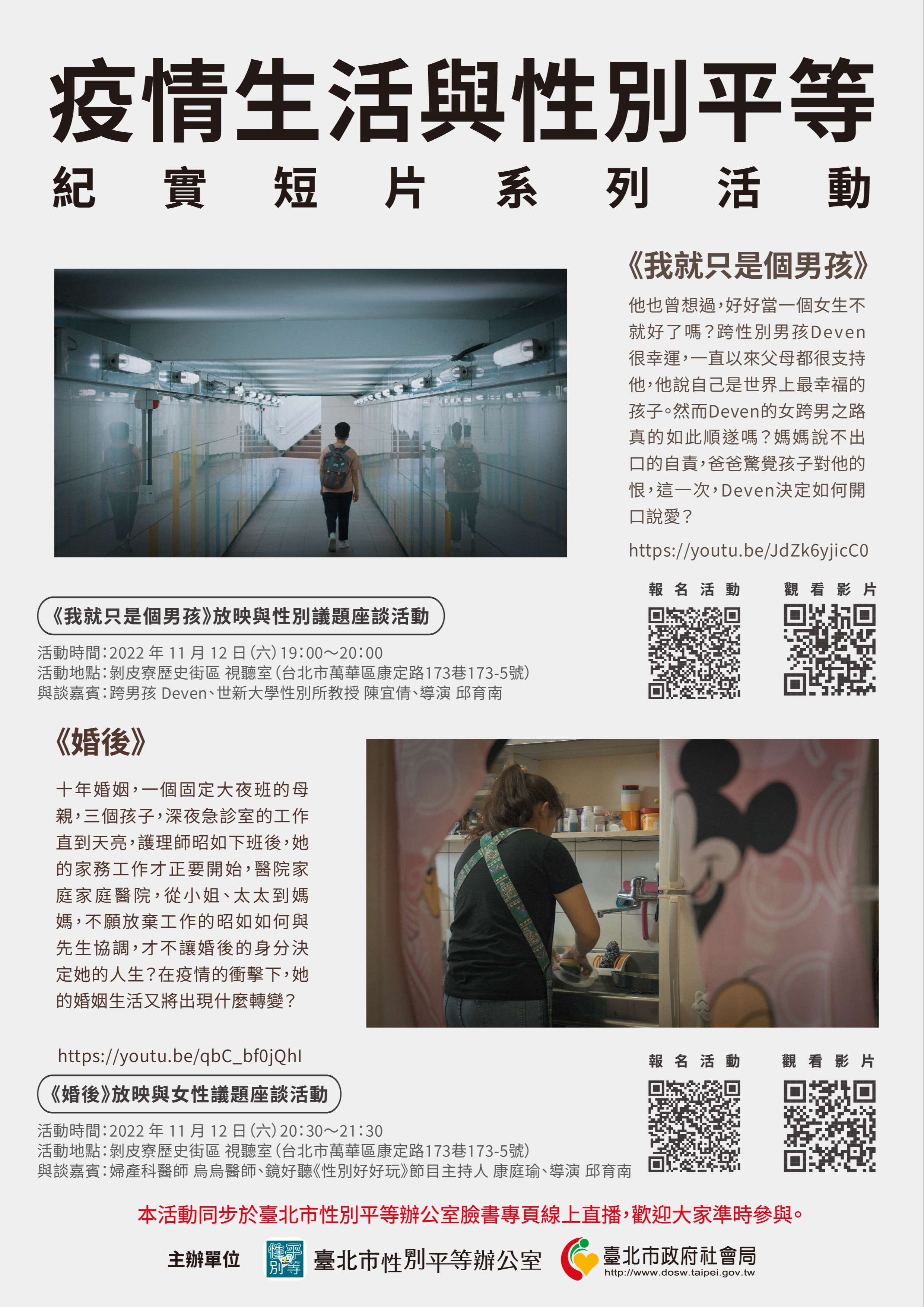 一、本市性別平等辦公室為擴展性平議題宣導之多元性與豐富性,本年度聚焦「疫情生活與性別平等」,分別製作《我就只是個男孩》及《婚後》2支紀實短片: