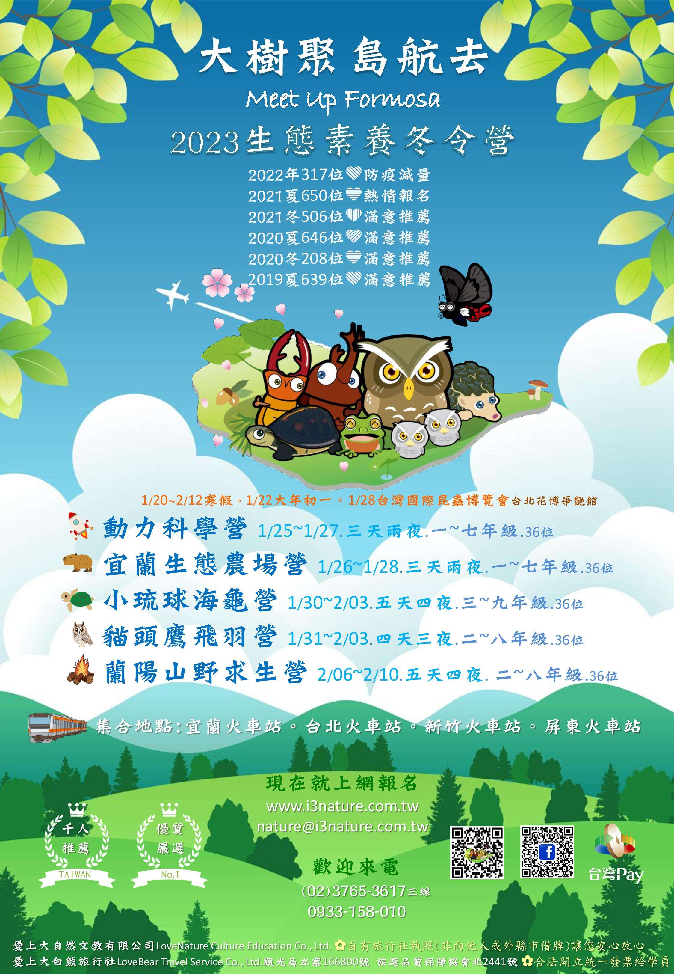 說明:愛上大自然文教有限公司將於112年寒假辦理【大樹聚。島航去】2023生態素養冬令營五個梯次;暨參展2023臺灣國