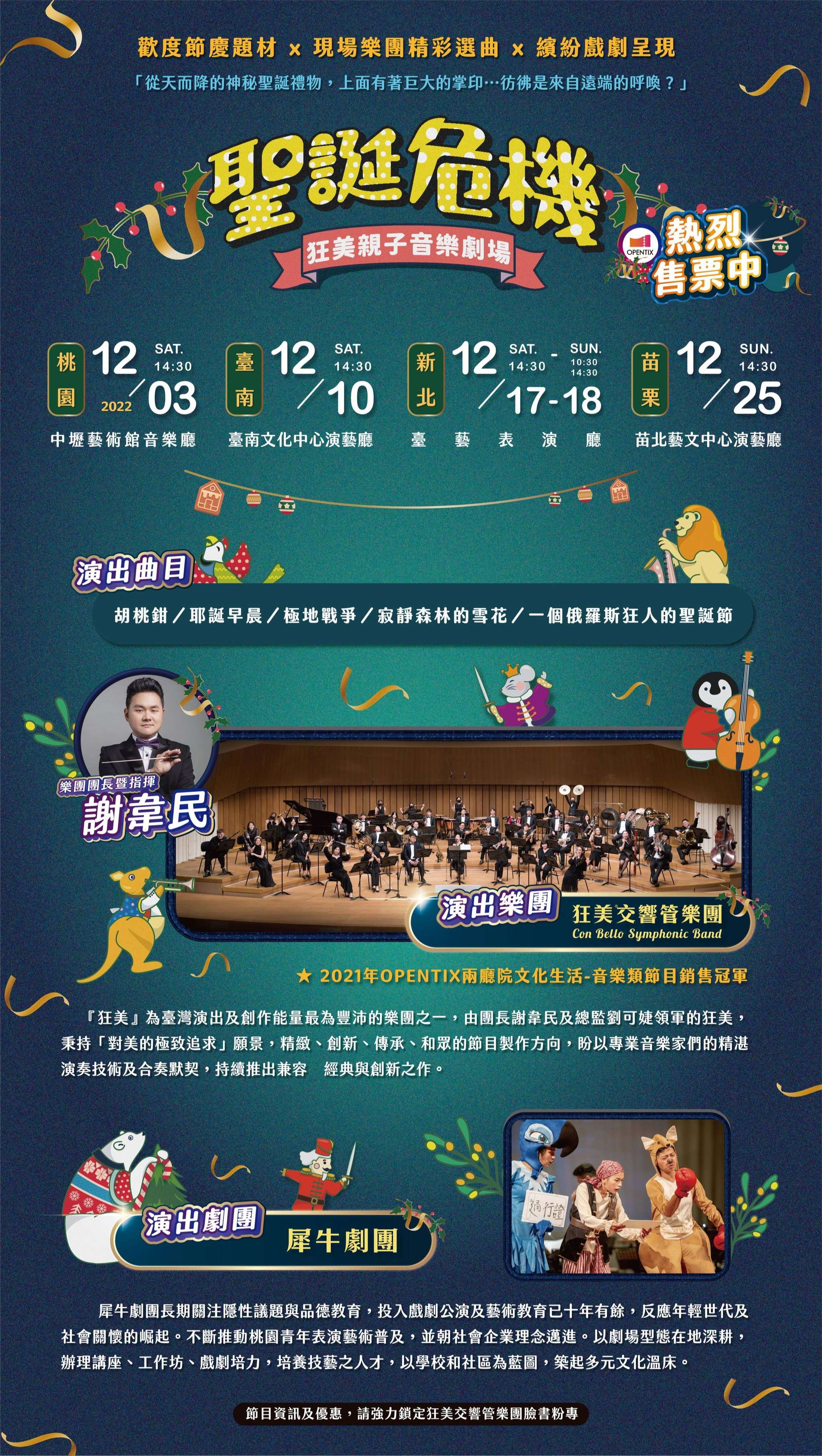 一、節目介紹:狂美交響管樂團自2017年起,致力打造以「管樂」為基底,跨界呈現的【狂美親子音樂劇場】,所推出之精彩節目,廣受觀眾好評。本次將再度與犀牛劇團為孩子打造〝節慶感〞新作《聖誕危機》,一起探討大自然環境共存議題,盼在溫馨的聖誕佳節前夕,給孩子與父母們擁有一場溫馨美好的看戲時光。