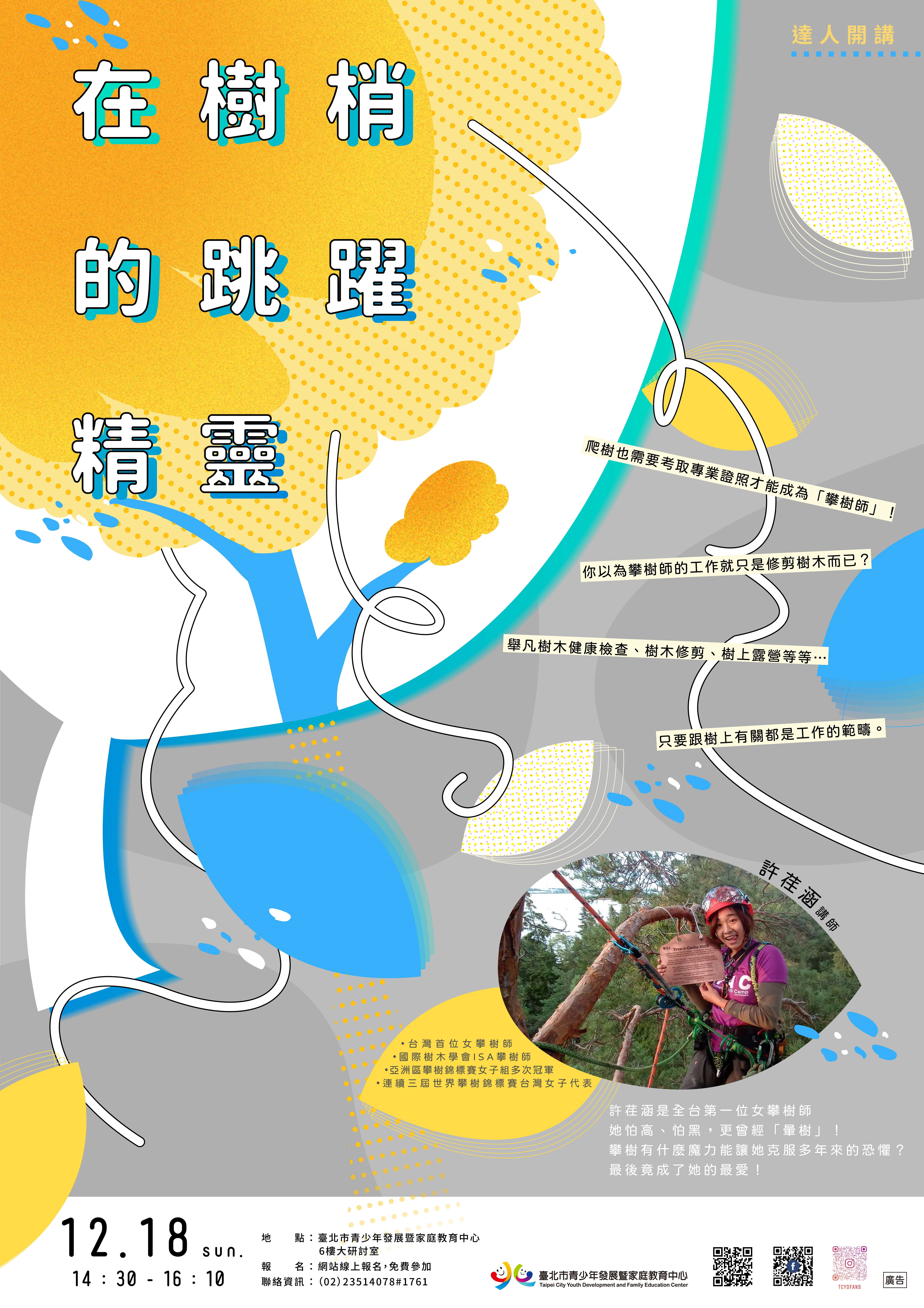 (一)90字:臺北市青少年發展暨家庭教育中心12月18日14:30舉辦達人開講「在樹梢的跳躍精靈」,攀樹師許荏涵老