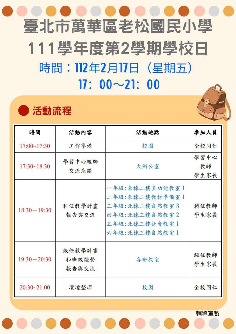 本校謹訂於112年2月17日(星期五)晚上舉行學校日,邀請家長和我們齊聚一堂,瞭解學校發展願景、課程教學計畫、班級經營理念,增進親師間相互了解與成長,提昇教育效能。