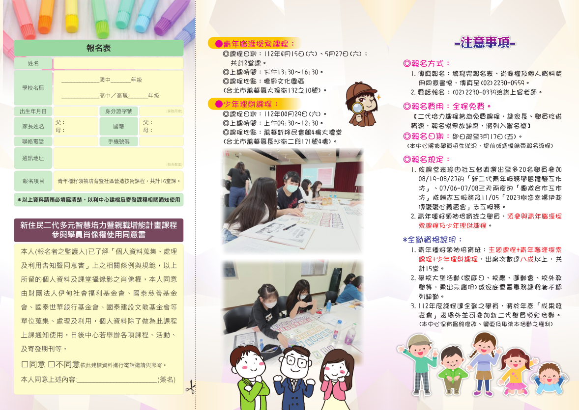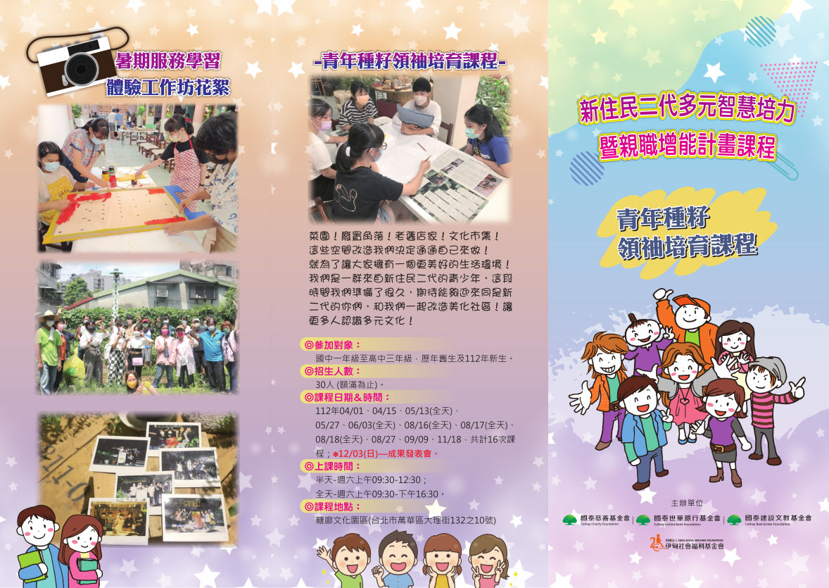 三、「新住民二代青年種籽領袖培育課程」之招生對象:國中一年級至高中三年級之新二代,課程辦理時間:112年04月01 日至11月18日,半天為週六上午9點30分至12點30分;全天為周六上午9點30分至下午4點30分;上課地點:糖?文化園 區(臺北市萬華區大理街132之10號)辦理,每月課程日期詳見招生宣傳單。