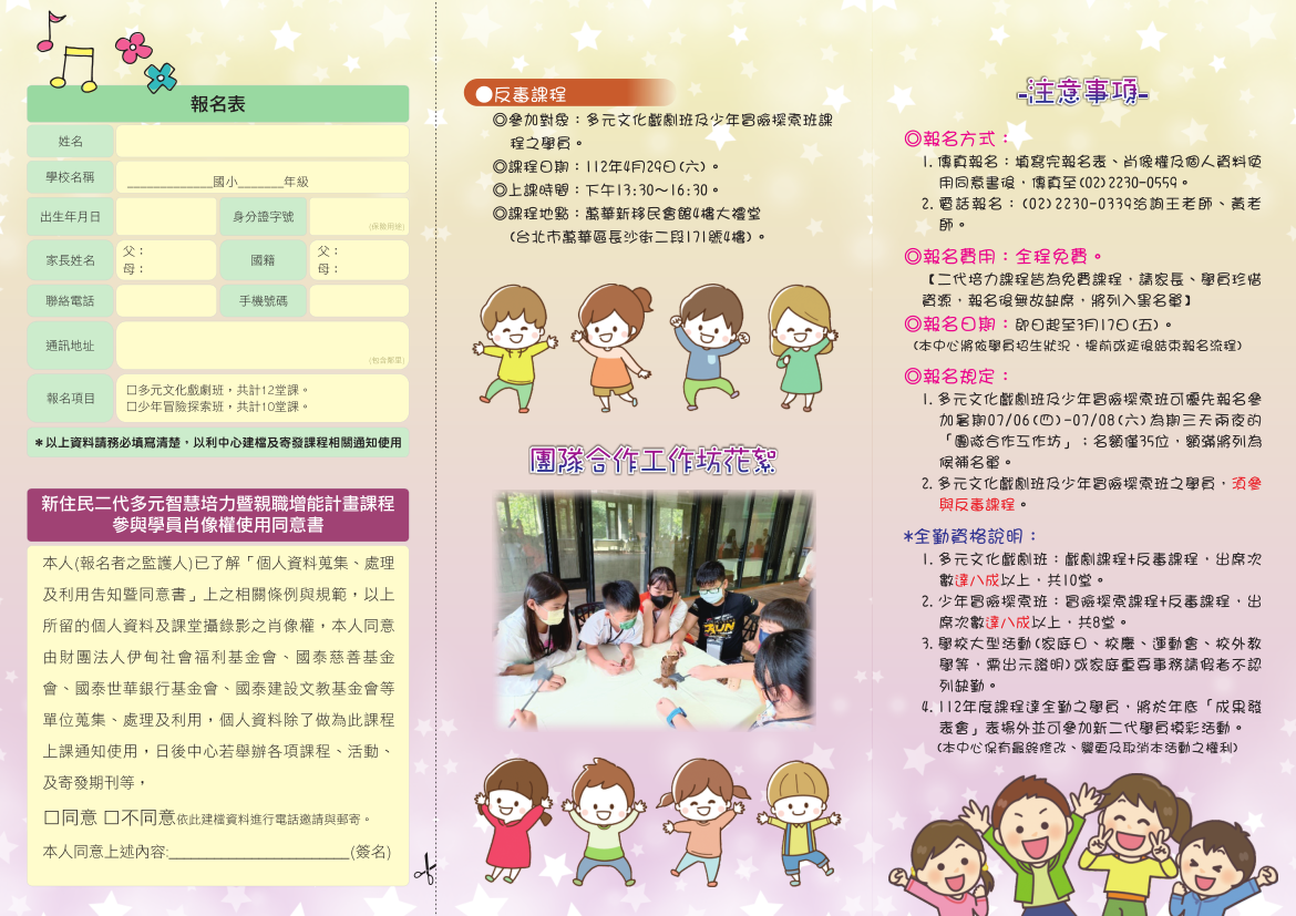 一、「新住民二代多元文化戲劇班」之招生對象:國小一至三 年級之新二代,課程辦理時間:112年03月11日至12月02 日,半天為週六上午9點30分至12點30分;全天為週六上午9點30分至下午4點30分;上課地點:台北市萬華新移民會館4樓辦理,每月課程日期詳見招生宣傳單。