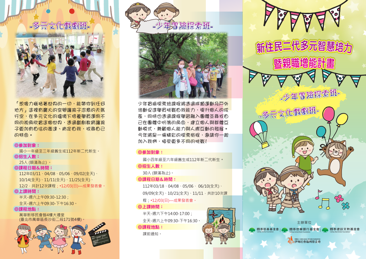 二、「新住民二代少年冒險探索班」之招生對象:國小四至六 年級之新二代,課程辦理時間:112年03月18日至11月11 日,半天為週六下午2點00分至5點00分;全天為週六下午2 點至下午5點;上課地點:場地未定,將於課前通知,每月課程日期詳見招生宣傳單。