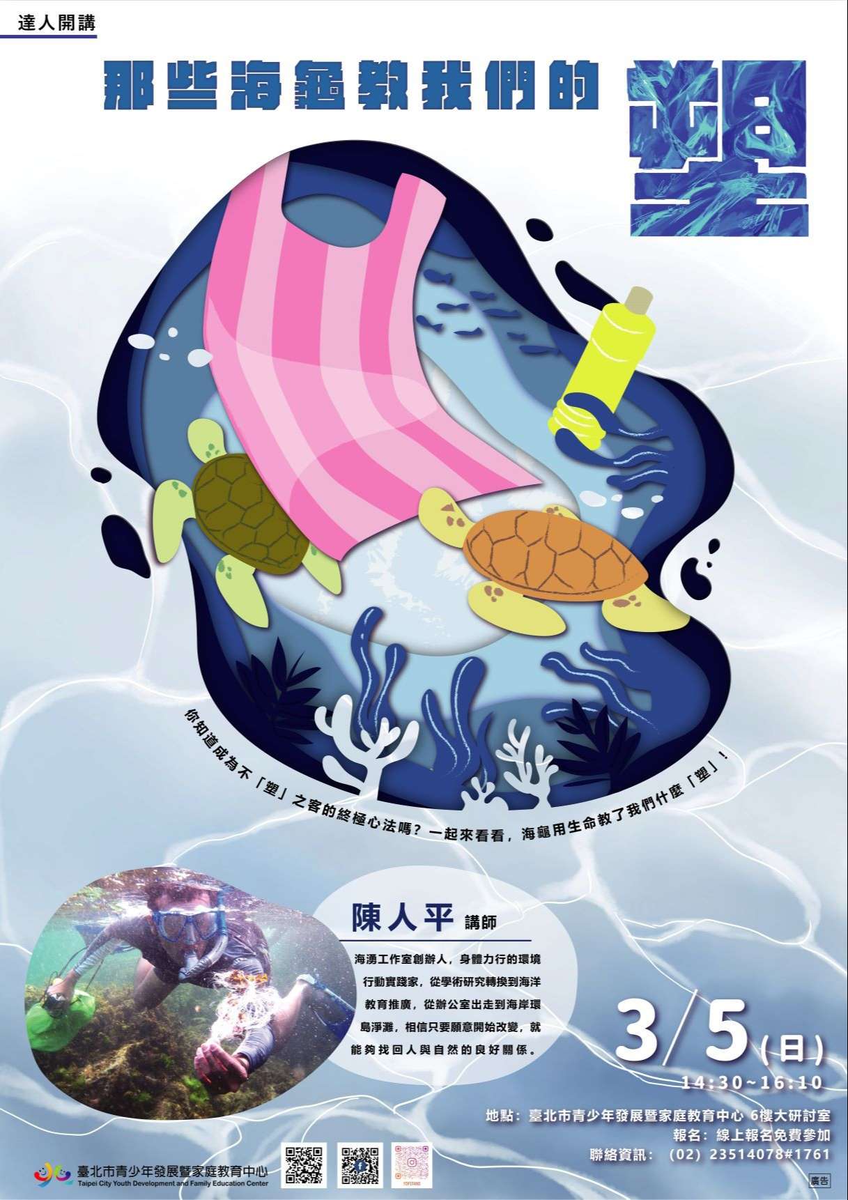 (二)60字:臺北市青少年發展暨家庭教育中心3月5日14:30舉辦達人開講:那些海龜教我們的塑。陳人平與您分享他踏上致力於海洋保育的