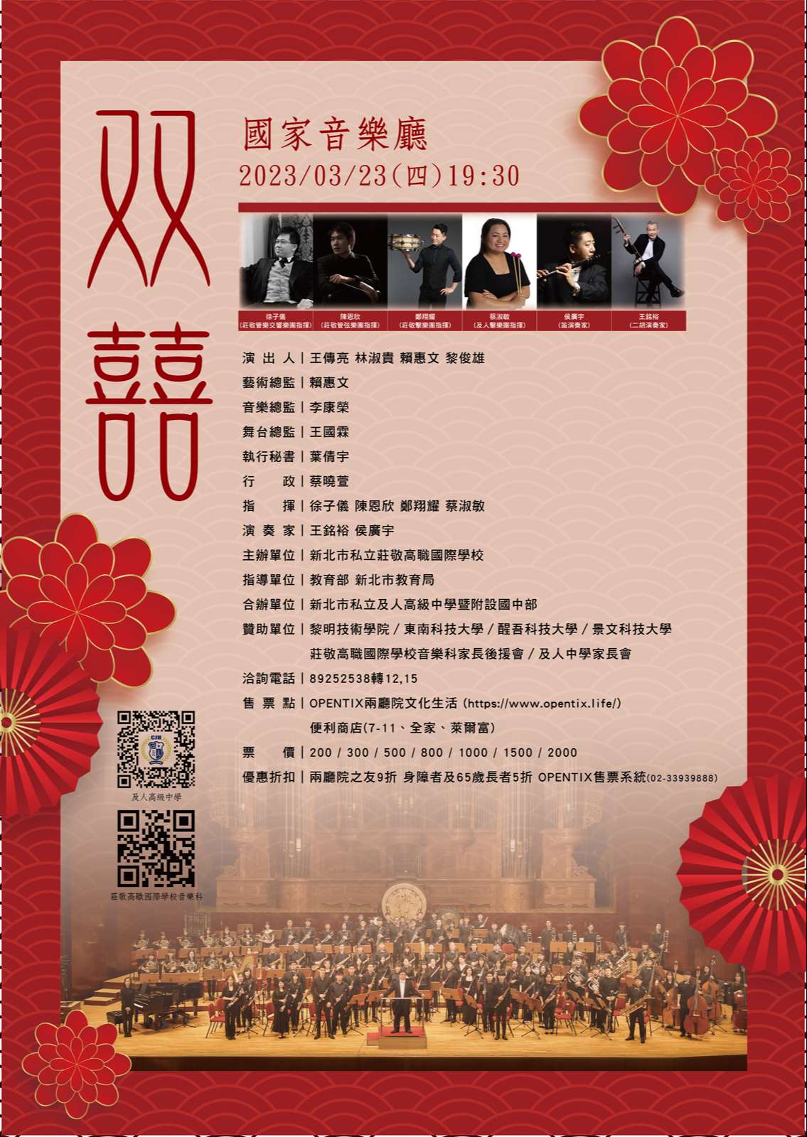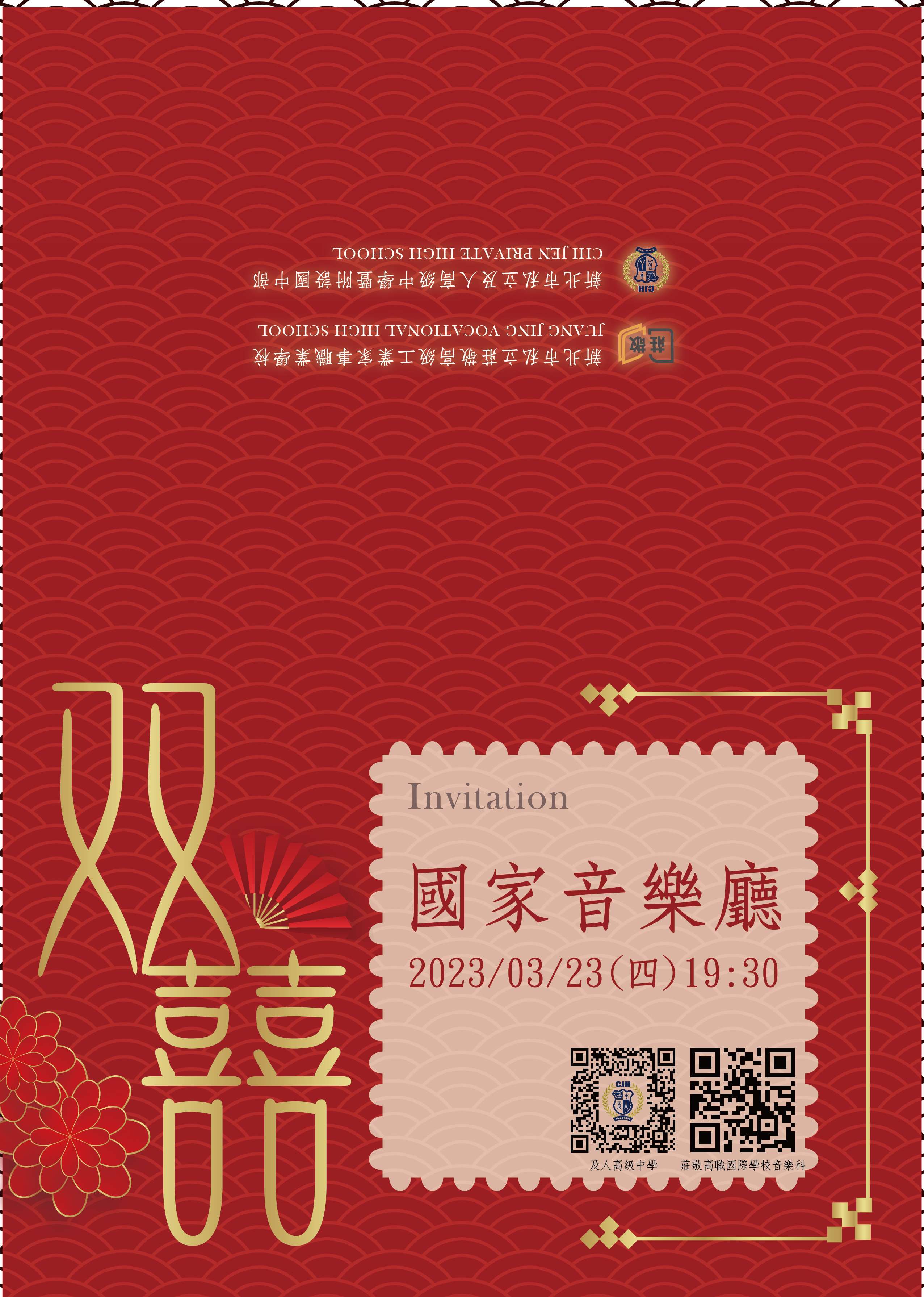 一、新北市私立及人高級中學擊樂團,訂於112年3月23日 (星期四)於國家音樂廳舉辦「双囍」音樂會,檢送活動海 報及邀請函電子檔,敬請惠予公告。