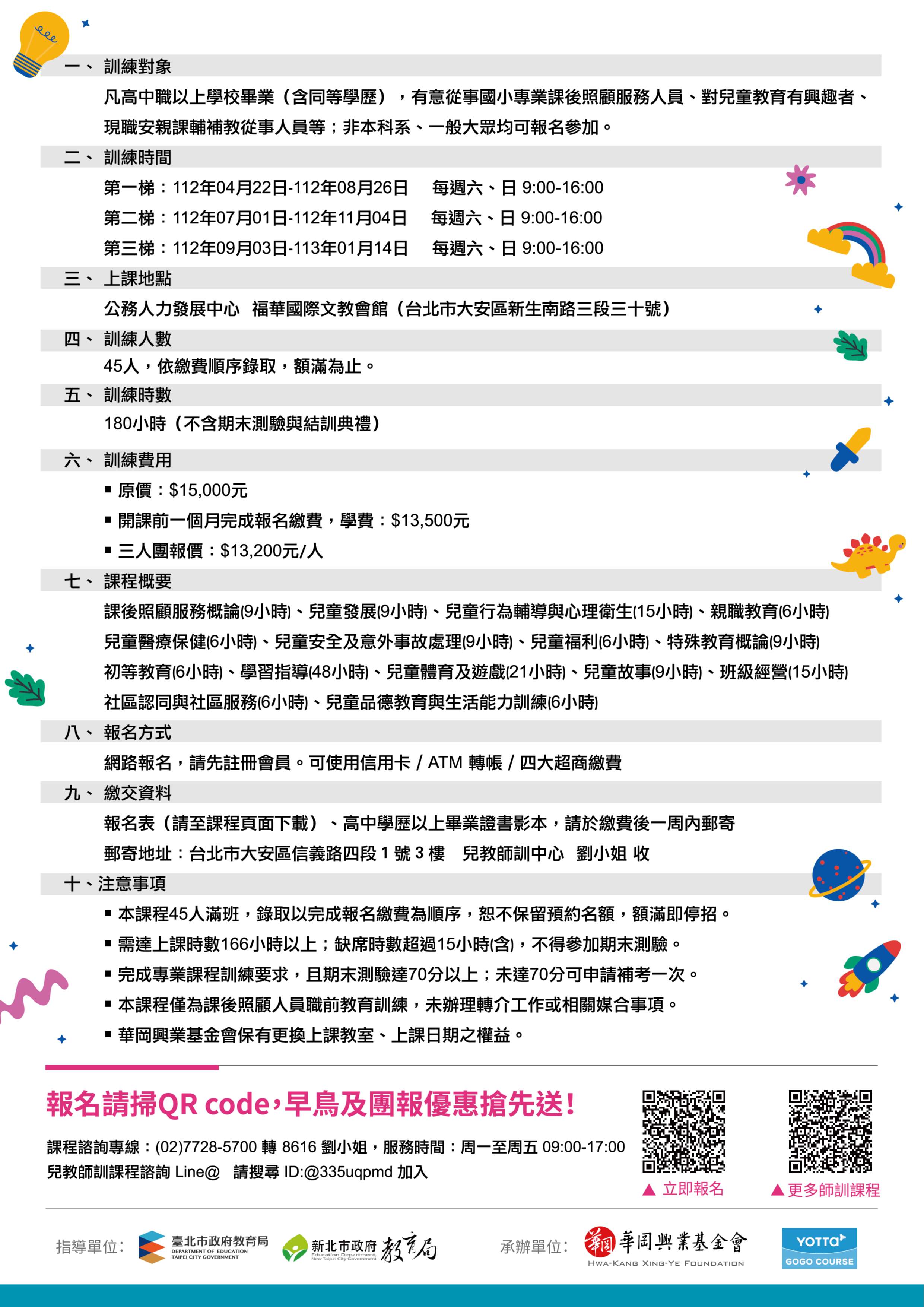 一、本訓練課程內容係依據教育局113年2月8日北市教終字第 1123016971號函核可之「兒童課後照顧服務人員職前訓練 課程執行計畫書」辦理。
