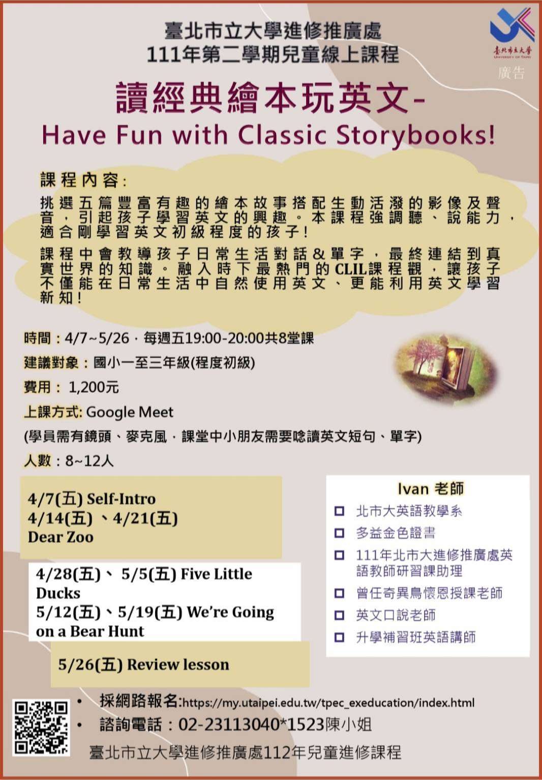 (五)網路報名:請至報名網頁報名https://my.utaipei.edu.tw/tpec_exeducation/index.html,點選左欄:112-春-讀經典繪本玩英文。