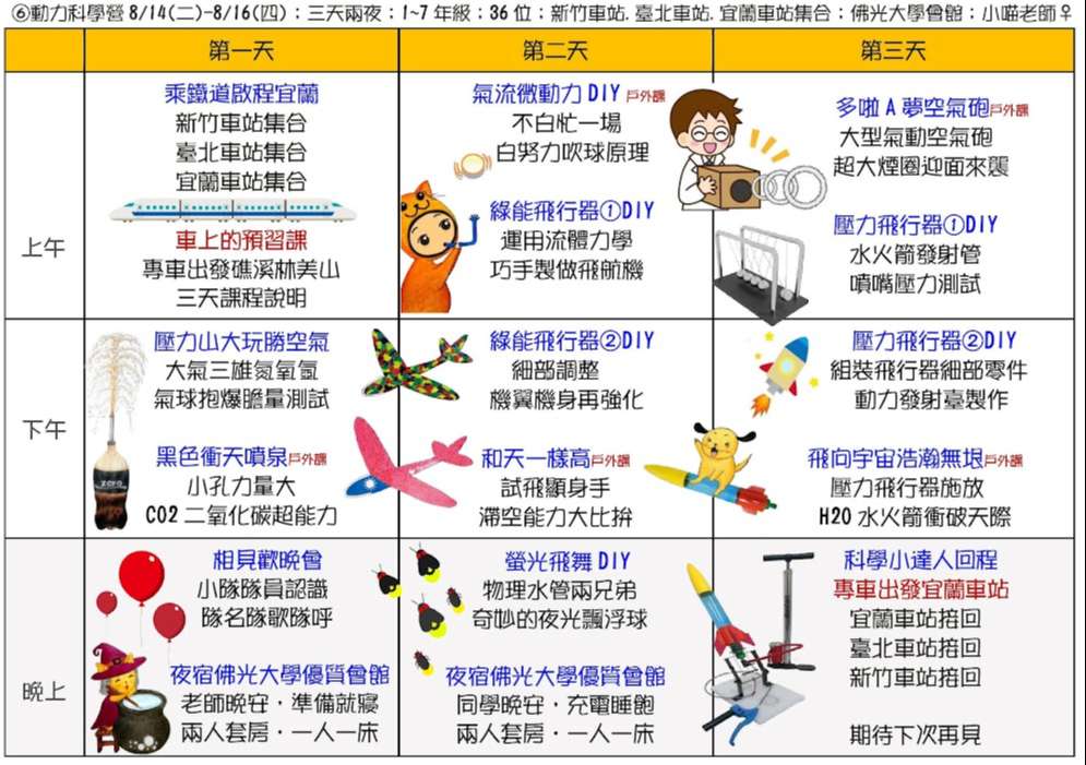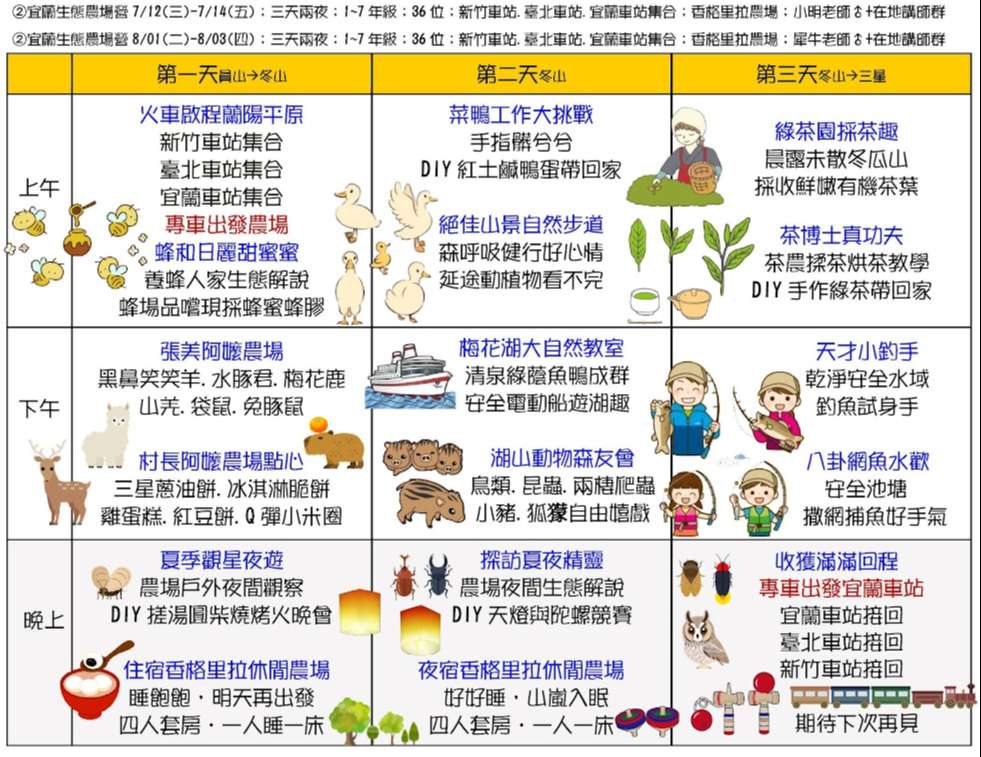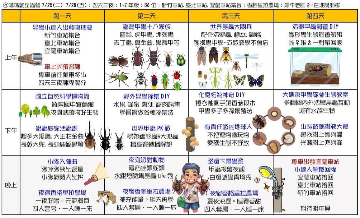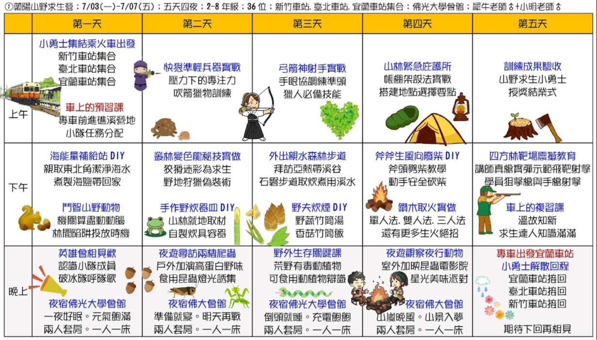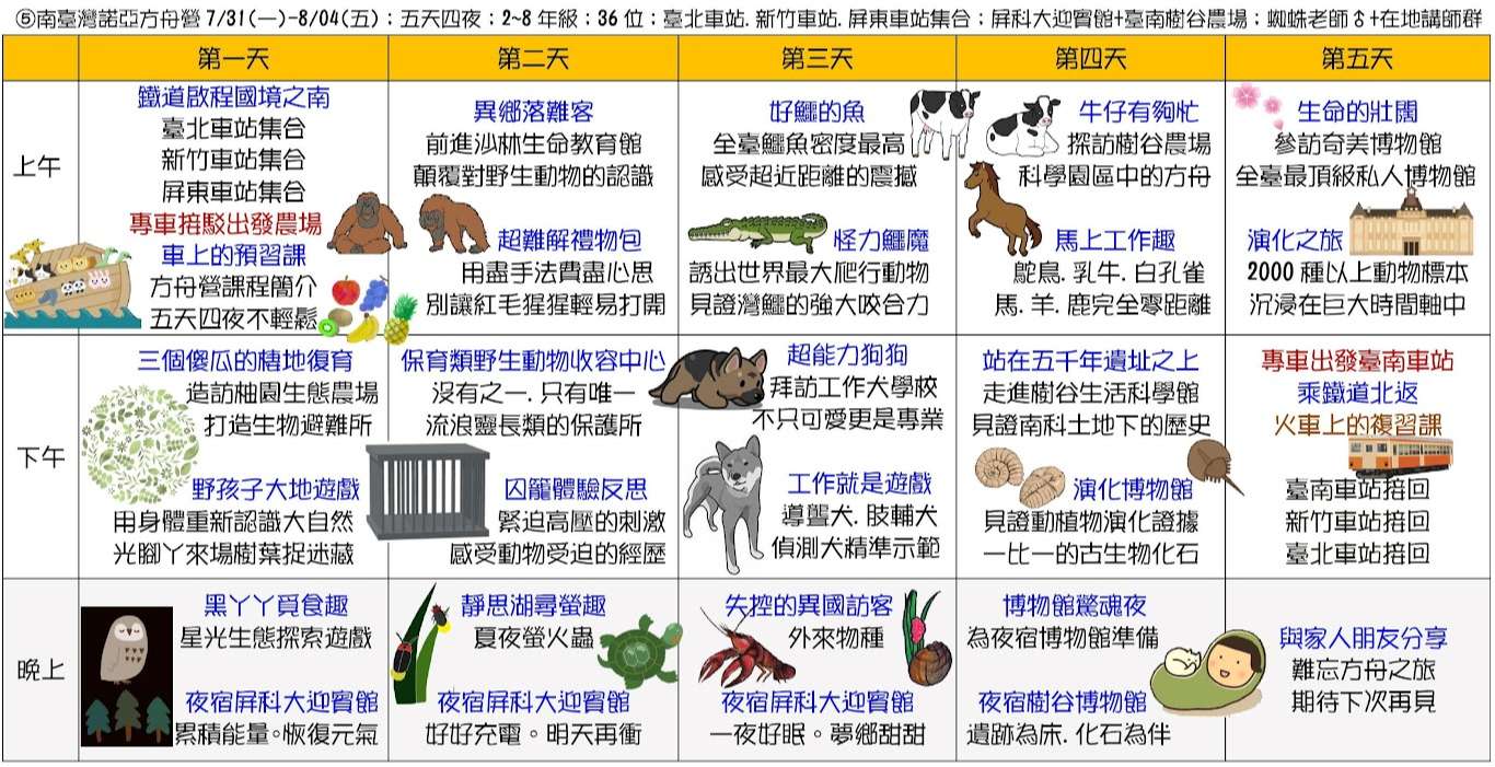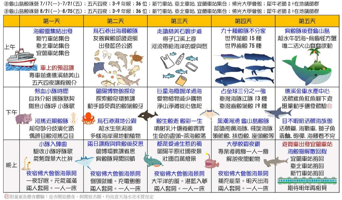 三、課程主題:蘭陽山野求生營(五天四夜)、宜蘭生態農場營 (三天兩夜)、龜山島鯨豚營(五天四夜)、噶瑪蘭昆蟲營(四 天三夜)、南臺灣諾亞方舟營(五天四夜)、動力科學營(三 天兩夜)。