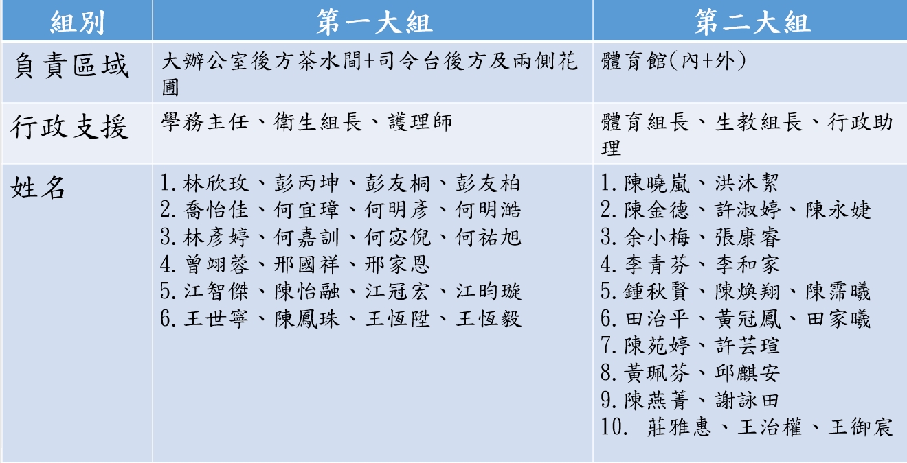 期待週六早上9:30與您們相見,一起愛護老松,打造更棒的校園,分組名單如下:。