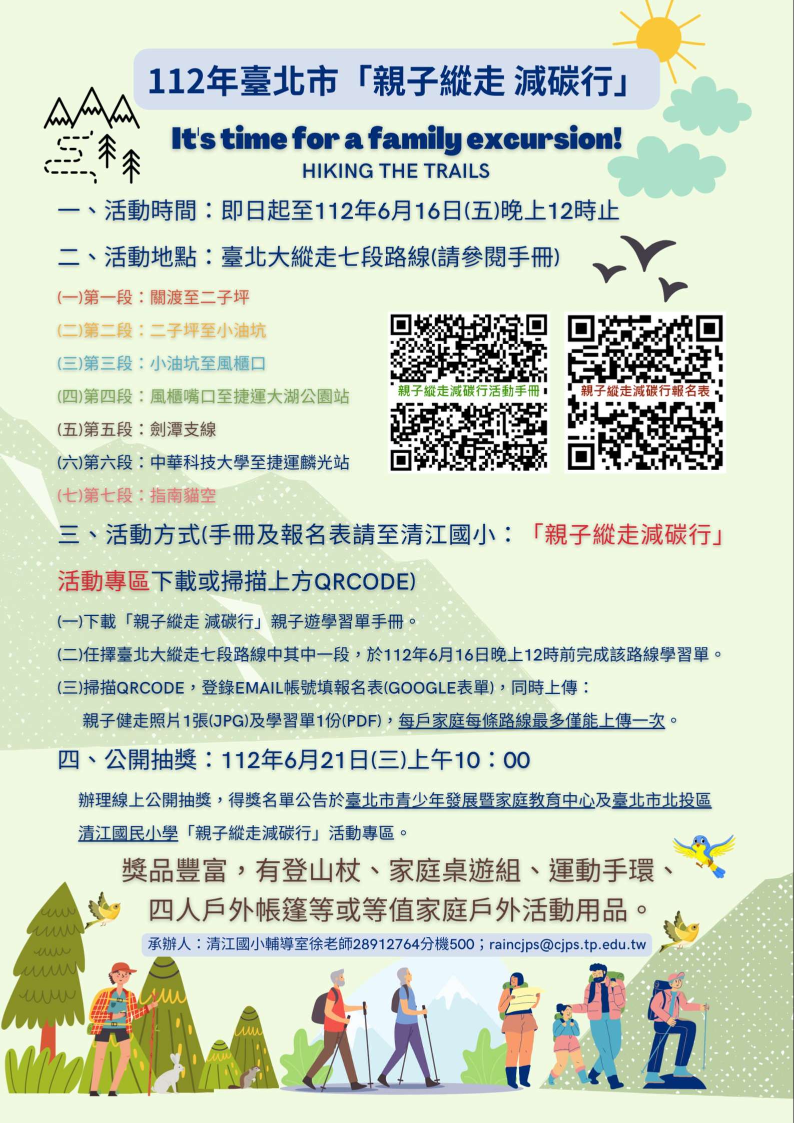 (二)任擇臺北大縱走七段路線中其中一段,於112年6月16日 (星期五)晚上12時前完成該路線學習單,並將基本資 料、親子健走照片1張及學習單1份,拍照上傳至指定網 址即可參加抽獎。