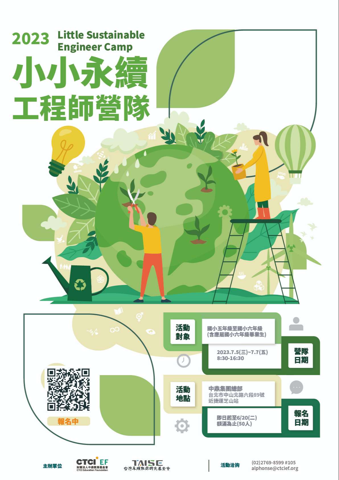 三、活動資訊摘要: 報名資訊:即日起至112年6月20日(二)止 (50人為限,額滿即止),僅接受網路報名,敬請進入活動 報名網頁 (https://taise.neticrm.tw/zh-hant/civicrm /event/info?reset=1&id=416 報名資格:112學年度國小 五、六年級生(含應屆畢業生)。 活動時間:2023年7月5日(三)至7月7日(五)(不過夜營隊)。 敬請持續關注本會FB粉 絲專頁(https://www.facebook.com/CTCIEF/ ) 及官網掌 握活動消息。 活動洽詢:中鼎教育基金會 林高級專員, 電話:(02)2769-8599 轉105。信箱:alphonse@ctcief. org。
