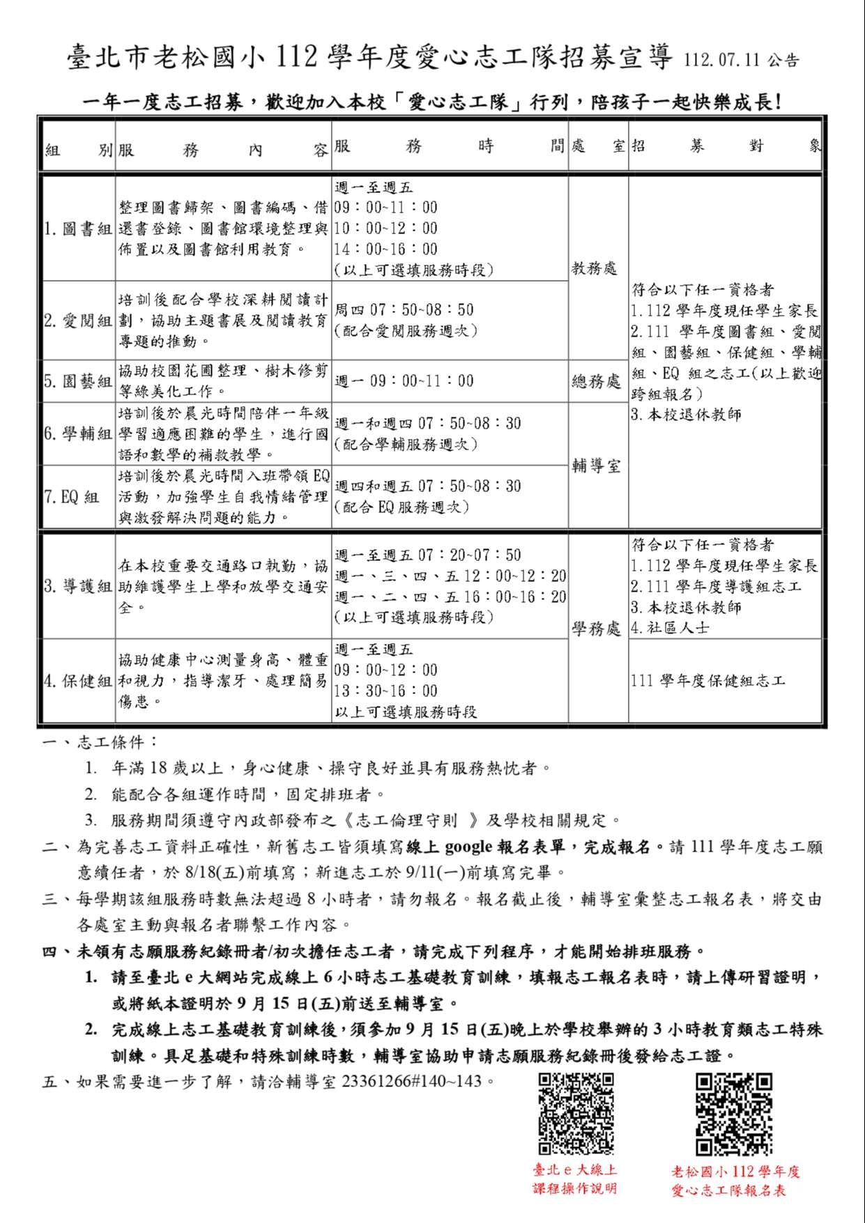臺北市老松國小112學年度愛心志工隊招募宣導