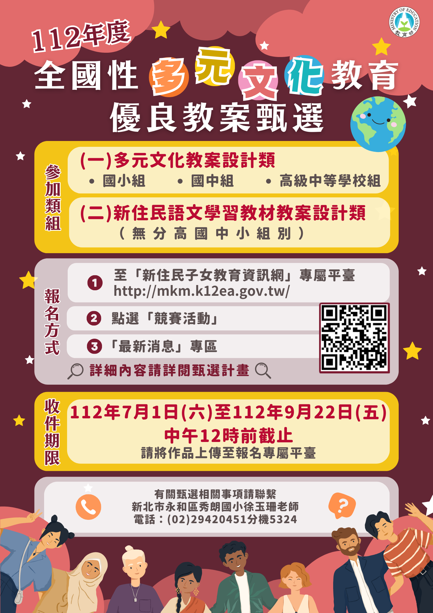 (四)繳交期限:112年7月1日(星期六)起至112年9月22日 (星期五)中午12時前截止,將作品上傳至「112年度全國性多元文化教育優良教案甄選」專屬平臺。