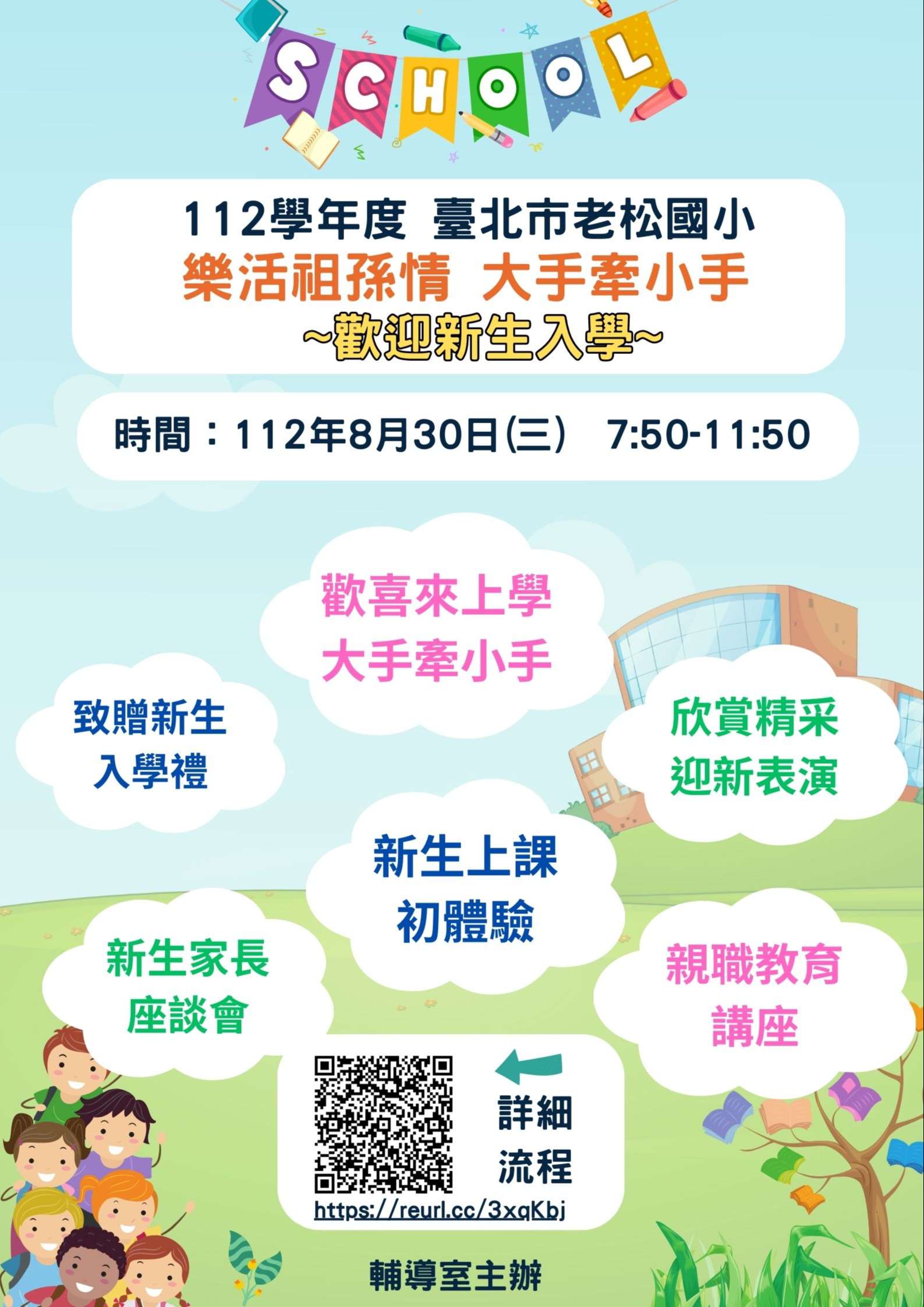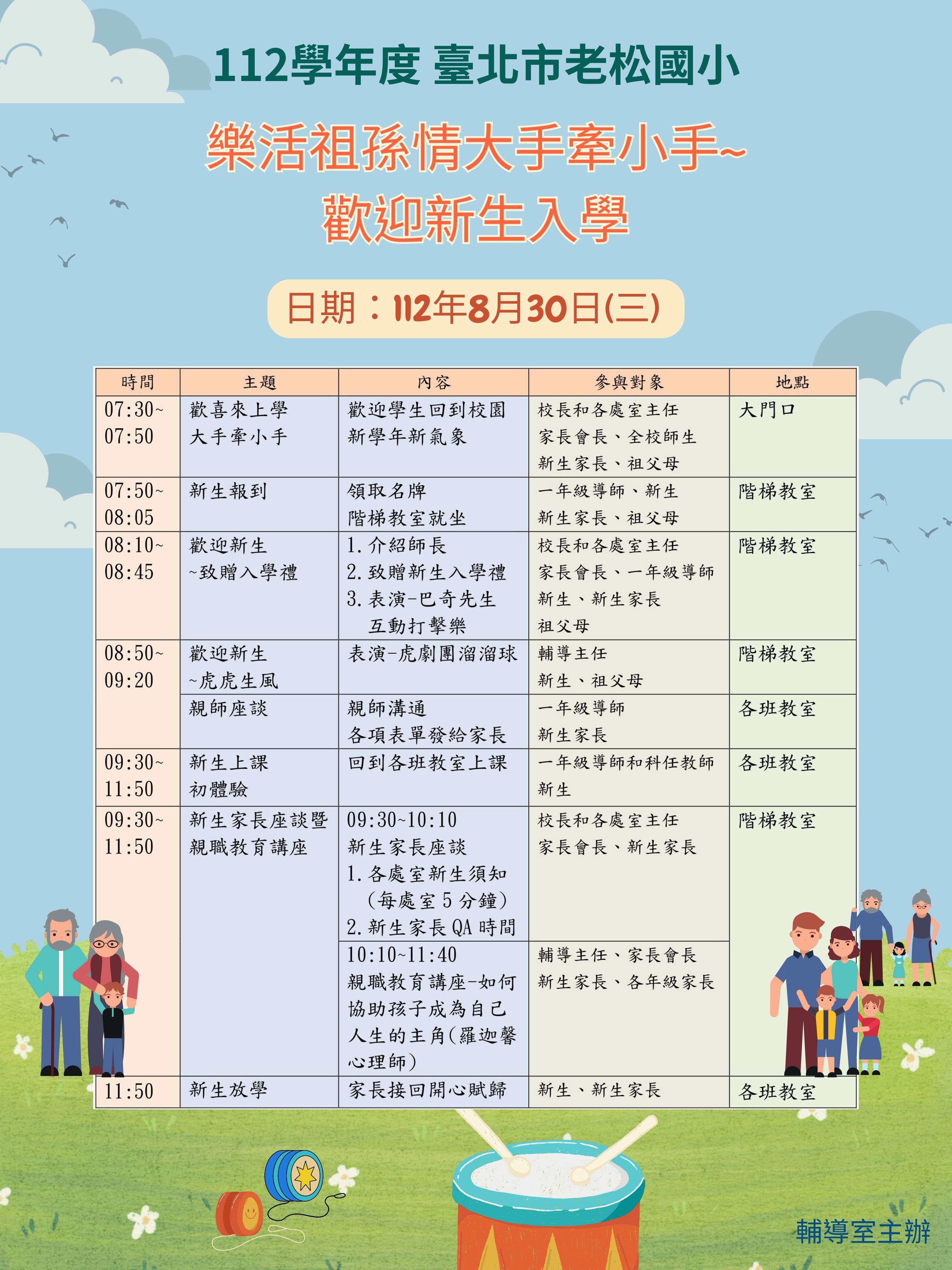 8/30(三)開學日,歡迎一年級新生入學,加入老松大家庭。當天上午7:50請一年級新生家長直接將小朋友帶到階梯教室報到,參加豐富精采的歡迎活動。歡迎祖父母陪著寶貝孫子來上學,大手牽小手!
