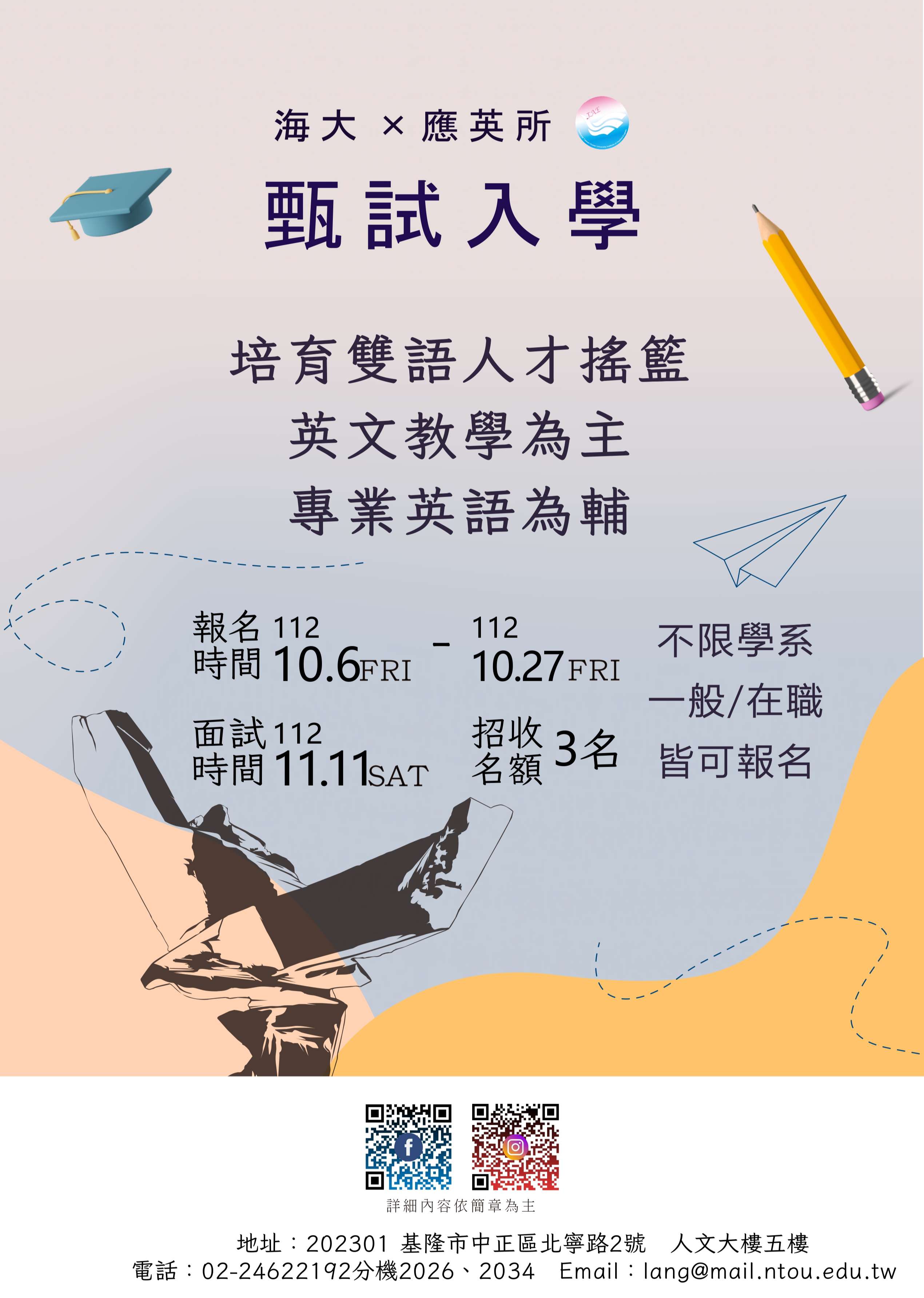 一、因應2030雙語國家政策,英語能力將成為就業必備條件之一。海大應用英語研究所以英語教學訓練爲主,專業英語為輔,適合對英語教學有興趣或未來職業欲使用英語者就讀。