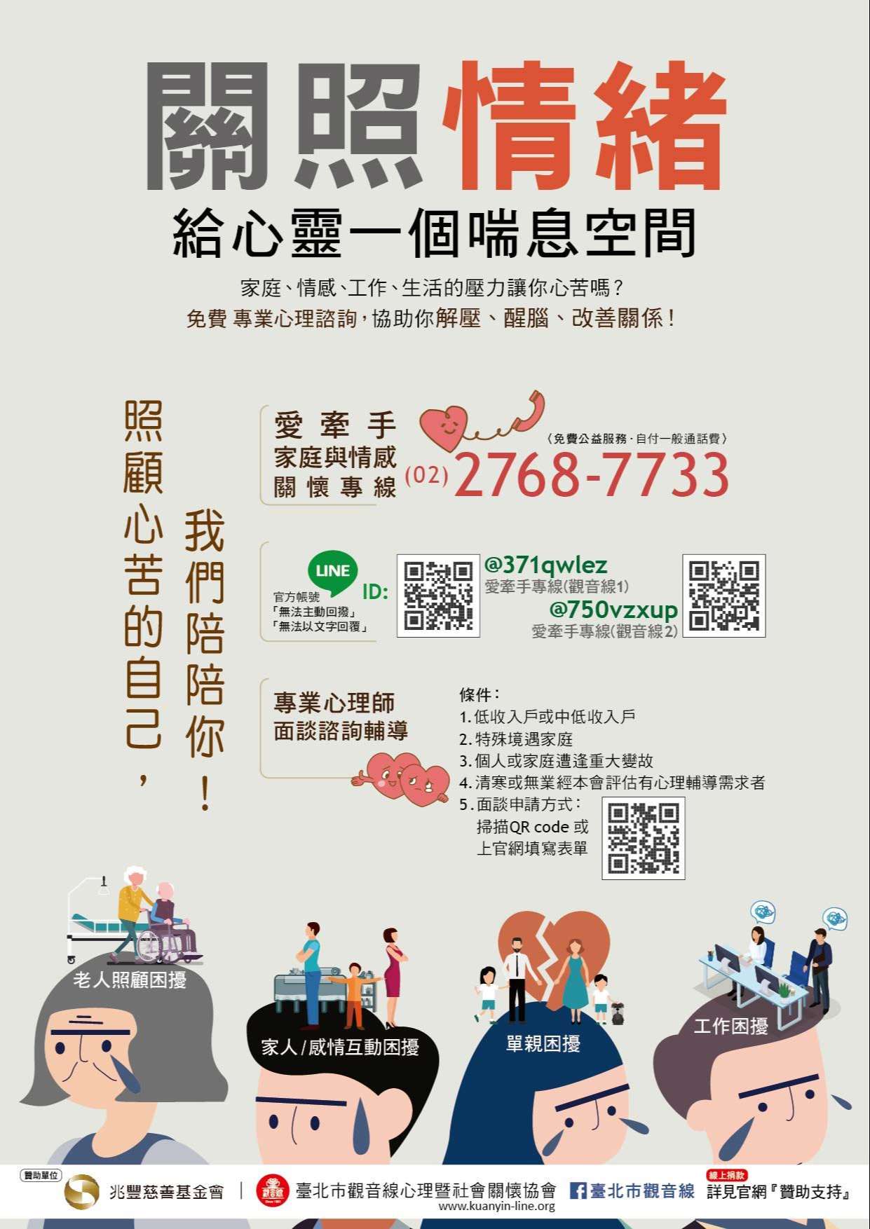 一、社團法人臺北市觀音線心理暨社會關懷協會「愛牽手家庭與情感關懷專線」與經濟弱勢「免費面談諮詢/諮商」服務簡介。