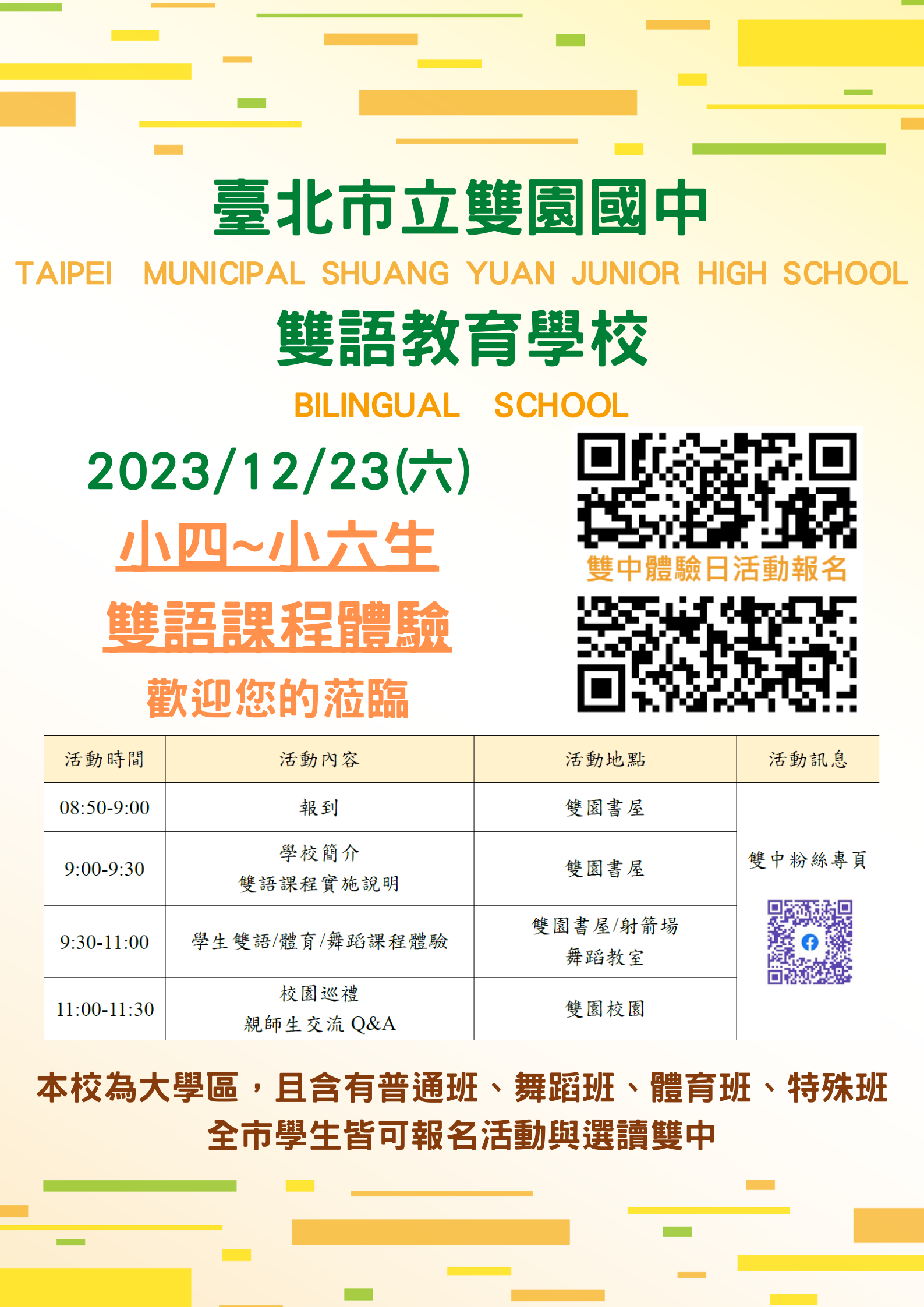 一、雙園國中已核定自111學年度起實施雙語課程,期透過辦學理念說明、學校簡介及課程體驗等活動,增進國小學生及 家長對雙園國中的瞭解。