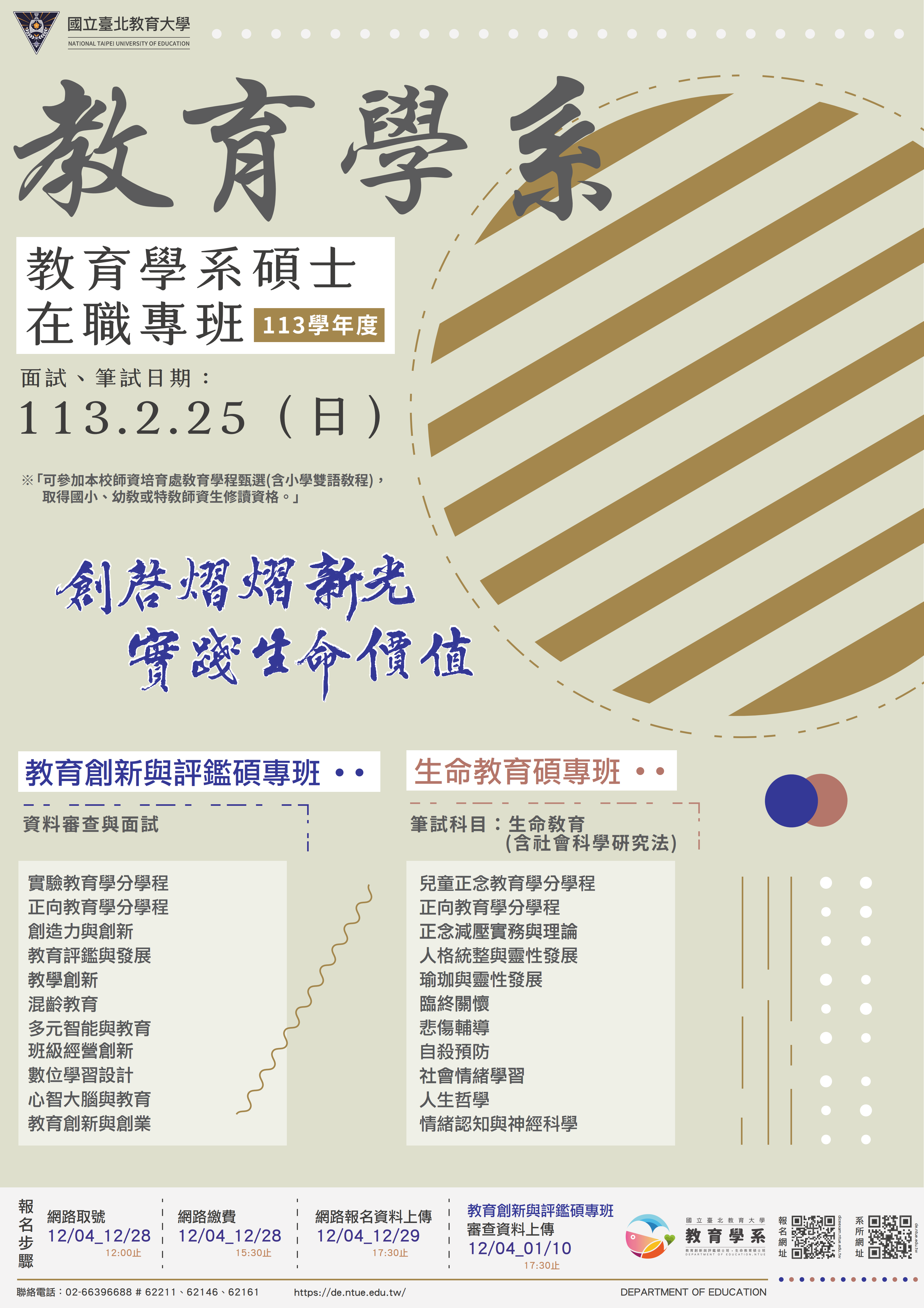 二、本系「教育創新與評鑑碩士在職專班」考試項目為資料審查及面試,審查資料上傳截止時間為113年1月10日下午5時 30分,面試日期為113年2月25日。