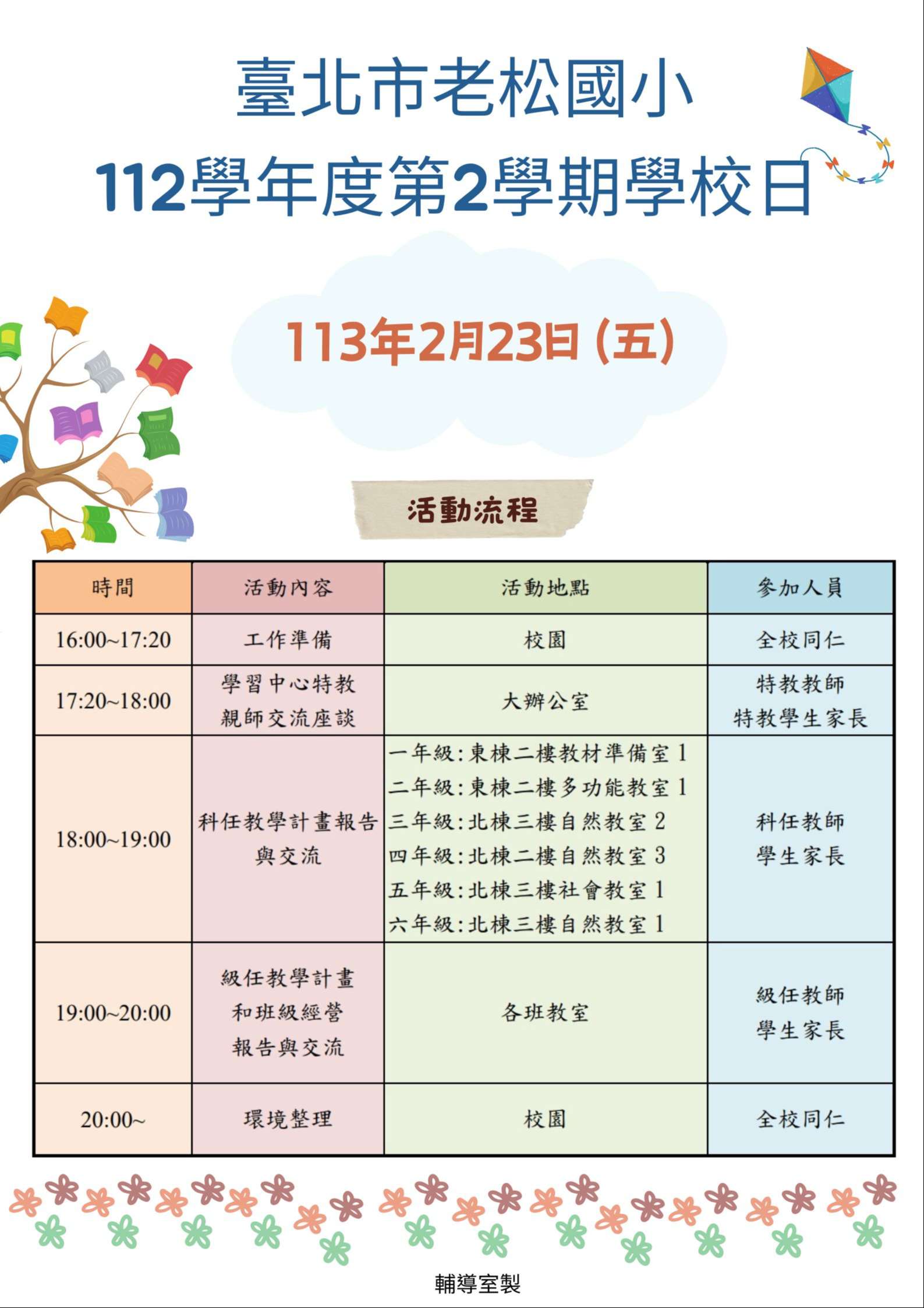 本校謹訂於113年2月23日(星期五)晚上舉行學校日,讓我們齊聚一堂,瞭解學校發展願景、課程教學計畫、班級經營理念,增進親師間相互了解與成長,提昇教育效能。邀請家長撥冗準時參加。