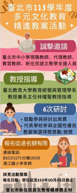 一、依據臺北市政府教育局113年度推展多元文化教育實施計畫暨臺北市113年度新住民語文教育輔導團年度計畫辦理。