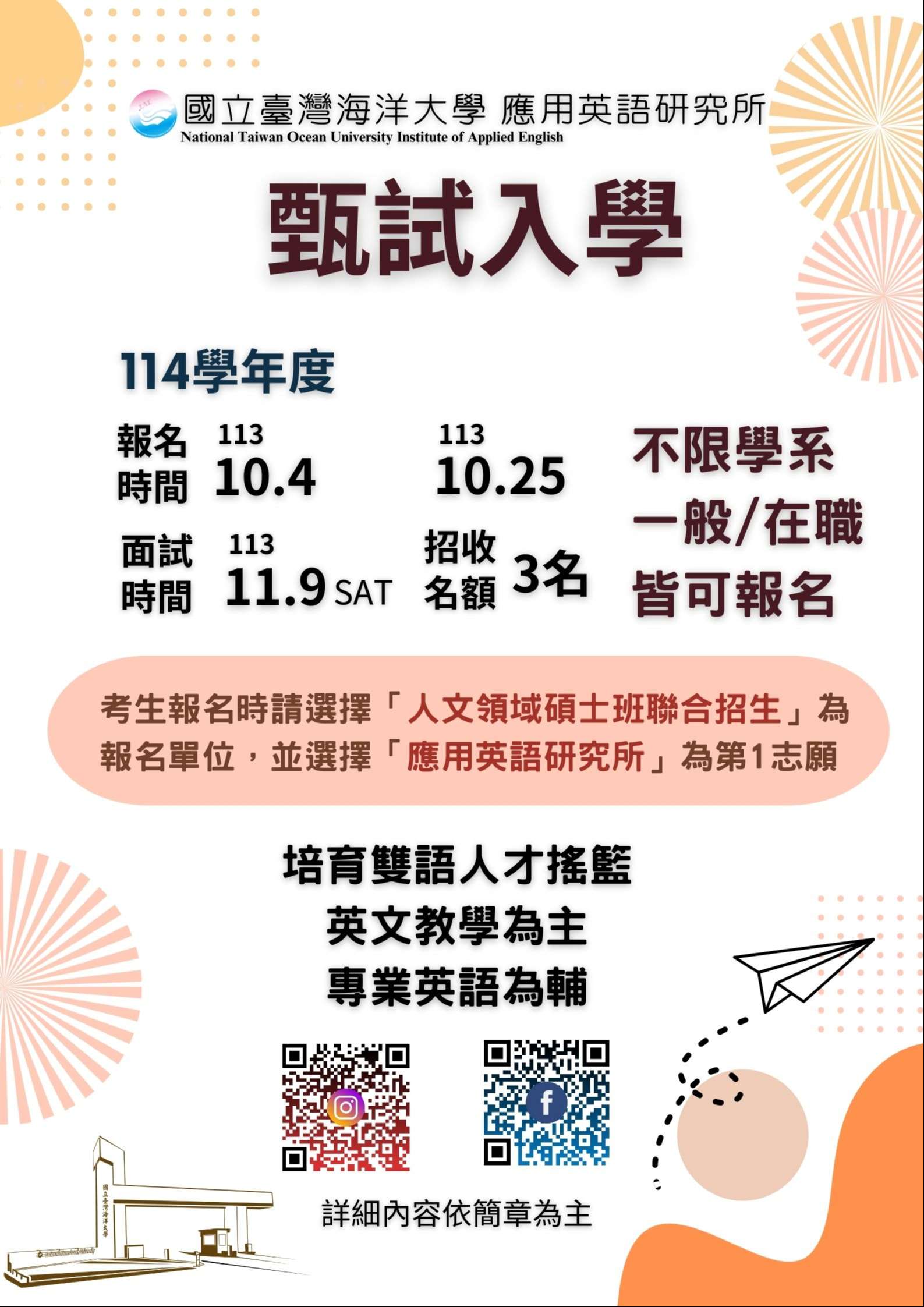 二、本校應用英語研究所114學年度碩士班甄試入學招收一般生 3名(在職者請以一般生報名)。