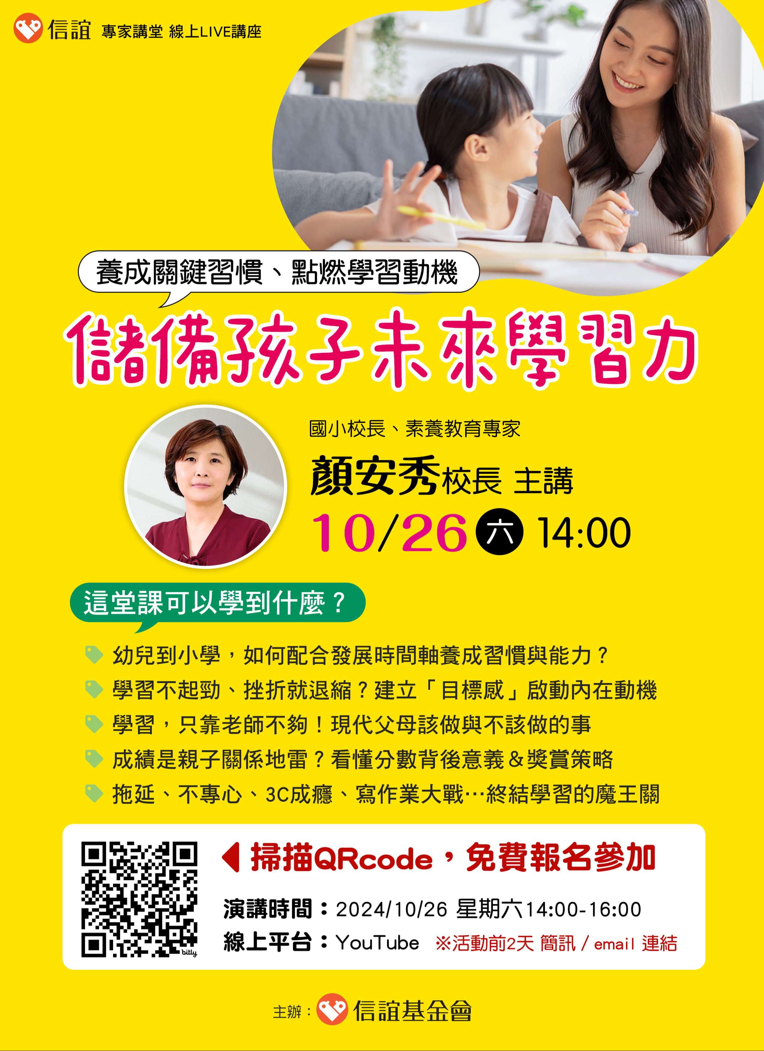 一、學習,是從出生就開始的事。學習力,則是影響未來很關鍵的技能。希望激發孩子學習熱忱、學得越來越好,只靠老師是不夠的!爸媽如何做才能幫助孩子儲備未來學習力呢?信誼將於2024年10月26日(六)下午2:00-4:00舉辦【養成關鍵習慣、點燃學習動機-儲備孩子未來學習力】 線上LIVE講座,邀請爸媽免費報名參加。
