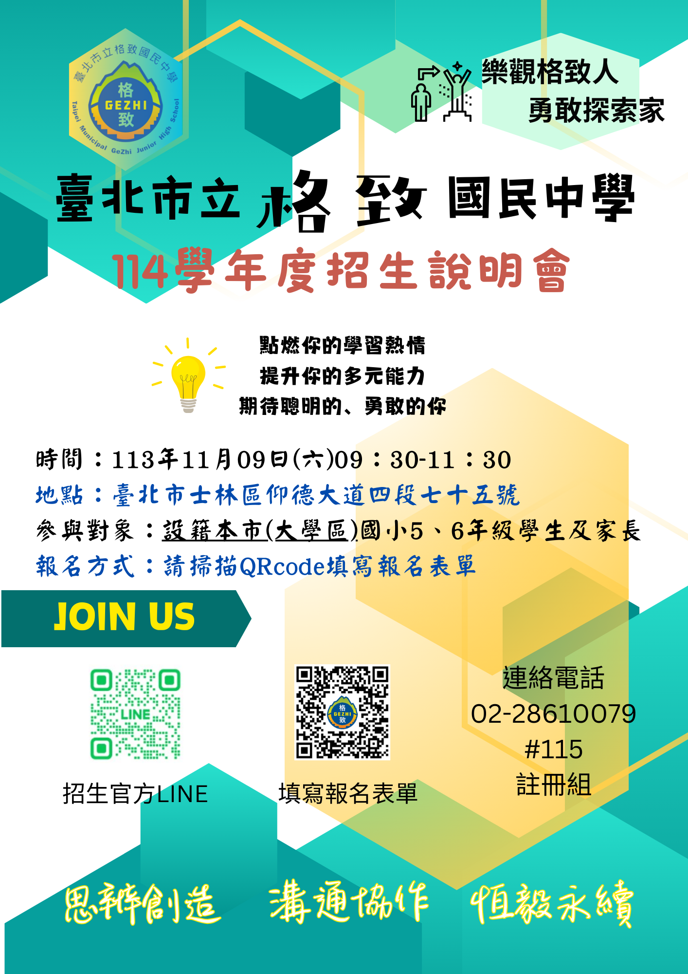 二、格致國中為大學區學校,凡設籍臺北市之新生皆可就讀。為使更多學生及家長了解格致國中辦學資訊,特辦理旨揭說明會。