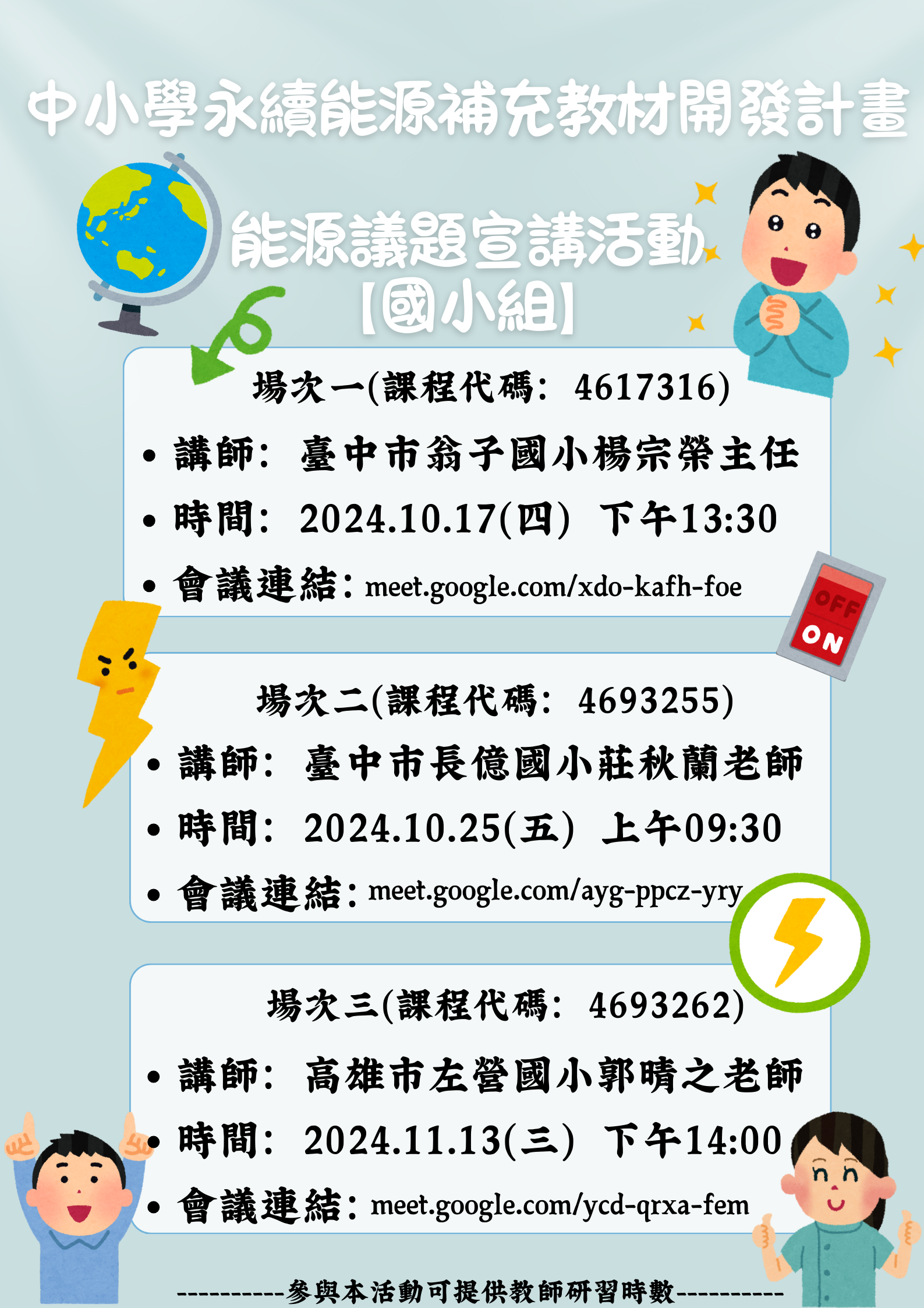 二、旨揭活動講師、時間及日期說明如下: (一)【國小組】場次一(課程代碼:4617316);講師:臺中 市翁子國小楊宗榮主任;時間:113年10月17日(星期 四)下午1時30分至3時;Google Meet連結:meet. google.com/xdo-kafh-foe。 (二)【國小組】場次二(課程代碼:4693255);講師:臺中 市長億國小莊秋蘭老師;時間:113年10月25日(星期 五)上午9時30分至11時0分;Google Meet連結:meet.google.com/ayg-ppcz-yry。 (三)【國小組】場次三(課程代碼:4693262);講師:高雄 市左營國小郭晴之老師;時間:113年11月13日(星期 三)下午2時至3時30分;Google Meet連結:meet. google.com/ycd-qrxa-fem。 (四)【國中組】場次一(課程代碼:4693273);講師:臺南 市安南國中余曉綺老師;時間:113年10月29日(星期 二)上午10時0分至11時30分;Google Meet連結:meet. google.com/erz-nkty-wxk。 (五)【國中組】場次二(課程代碼:4693280);講師:臺中 市潭子國中梁瑞秢老師;時間:113年10月31日(星期 四)下午2時0分至3時30分;Google Meet連結:meet. google.com/rpx-zyjc-syg。 (六)【國中組】場次三(課程代碼:4693286);講師:高雄 市大樹國中郭政源主任;時間:113年11月14日(星期 四)上午10時0分至11時30分;Google Meet連結:meet. google.com/nho-pvnv-fup。