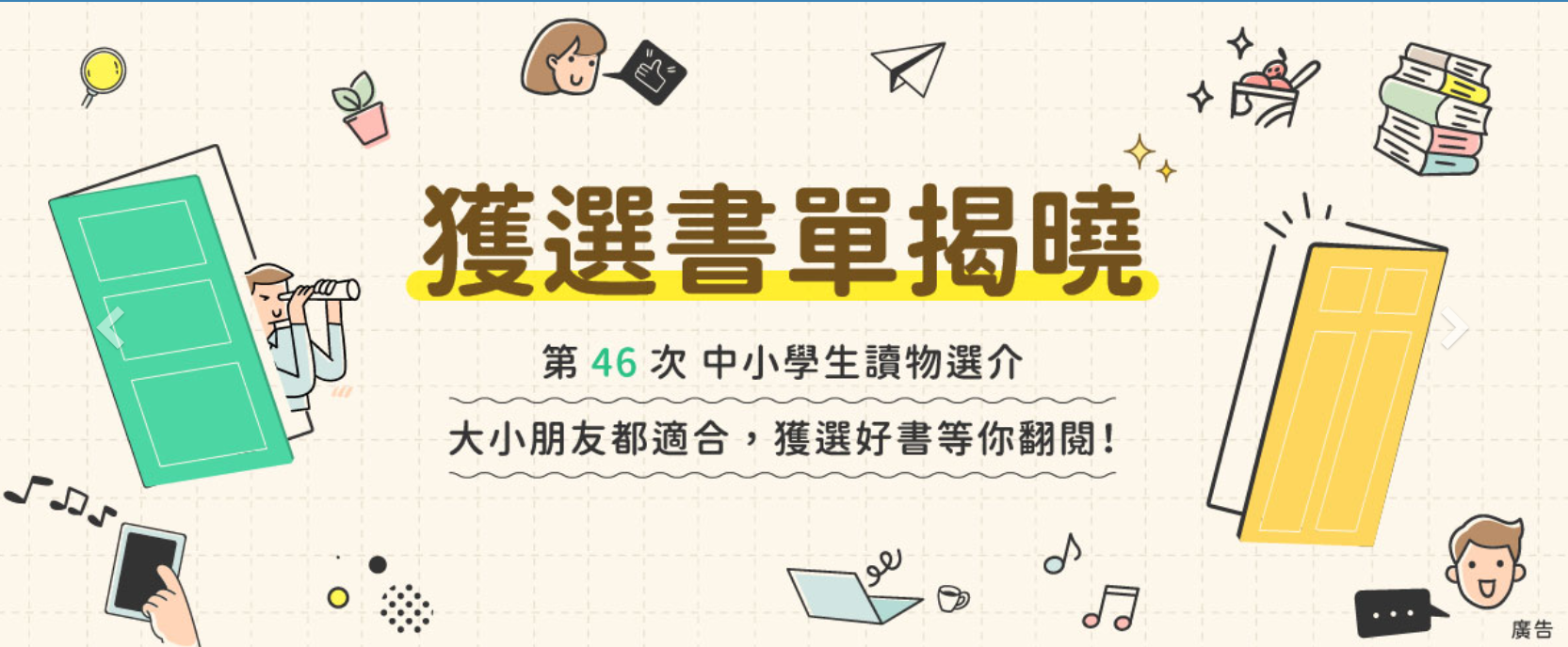 文化部為鼓勵出版業者提升中小學生讀物品質特辦理中小學生讀物評選,由專業評審篩選書籍進行推薦,本年度(第46次) 獲選書單、評選報告及評選標準業已公布於活動網站,詳細內容可至活動網站查詢。