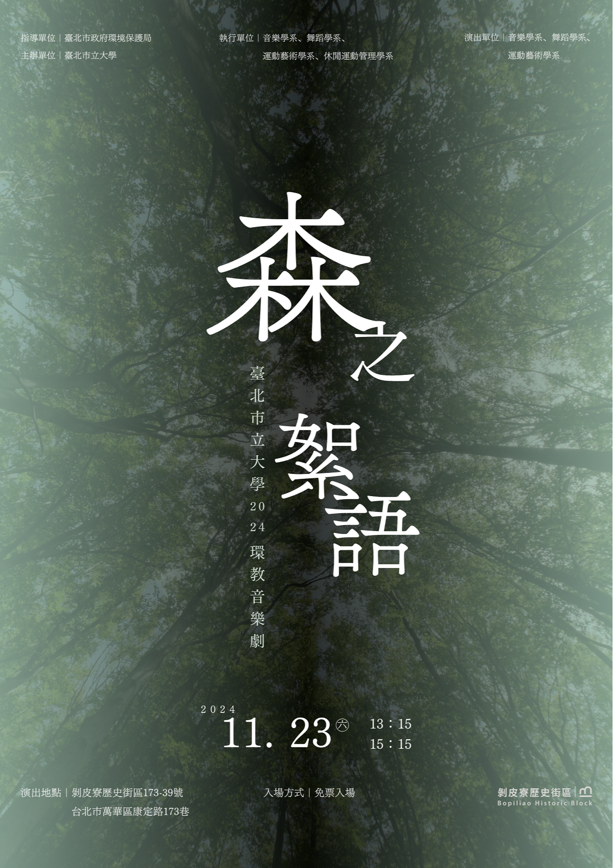 一、都市發展與綠色空間保存間的平衡是當代重要課題,由本 校音樂學系、舞蹈學系、運動藝術學系及休閒運動管理學 系共同舉辦「環境教育-《森之絮語》音樂劇」展演,透 過音樂劇引導觀眾反思永續發展的重要性,持續為環境保 護盡一份心力。為達教育及推廣目的,敬邀貴校師生一同 參與欣賞。