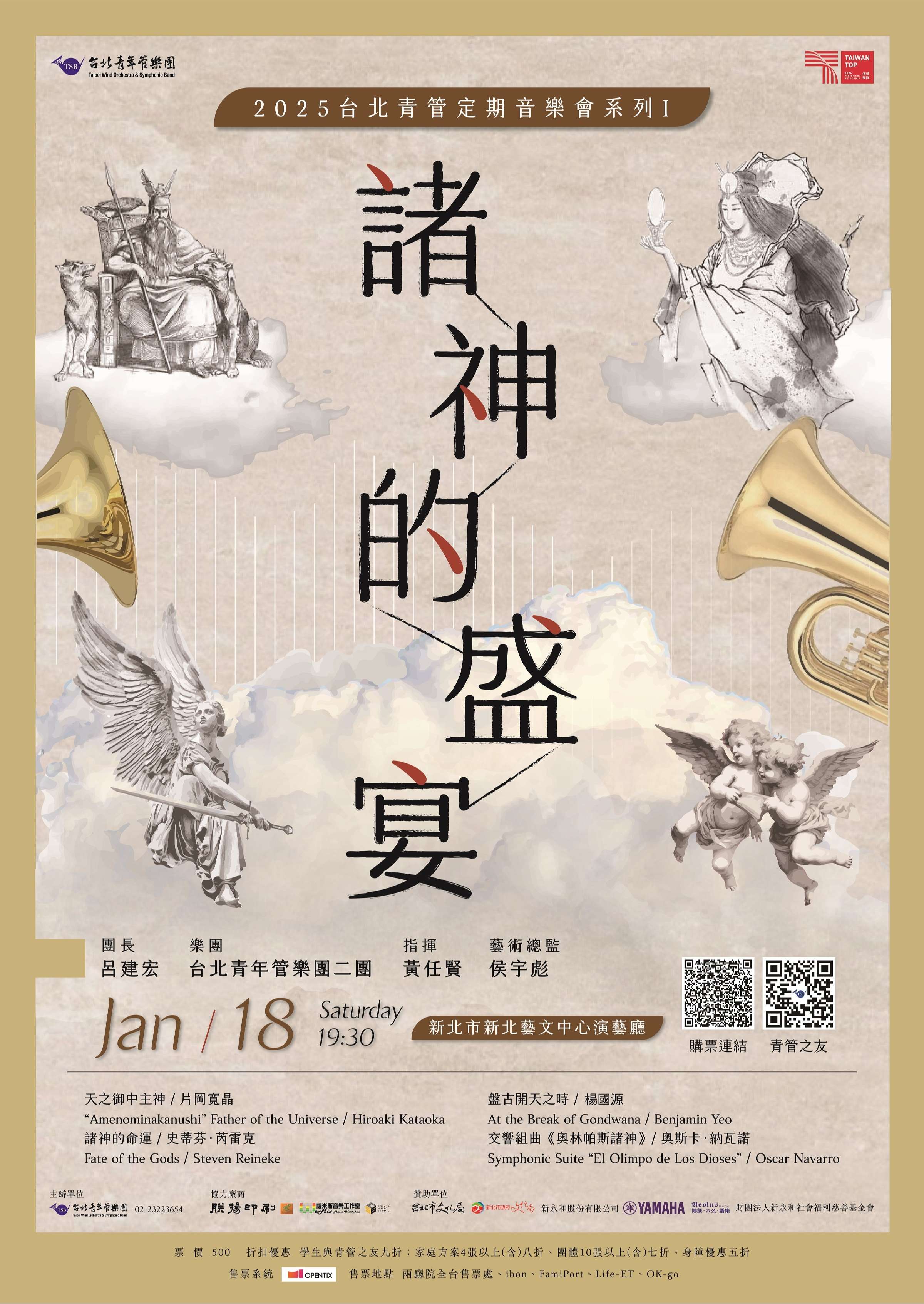 一、2025台北青管定期音樂會系列I,精選描寫東西方如日 本、北歐與希臘眾神明的音樂,由國家交響樂團法國號助 理首席黃任賢老師,指揮台北青年管樂團二團演出。