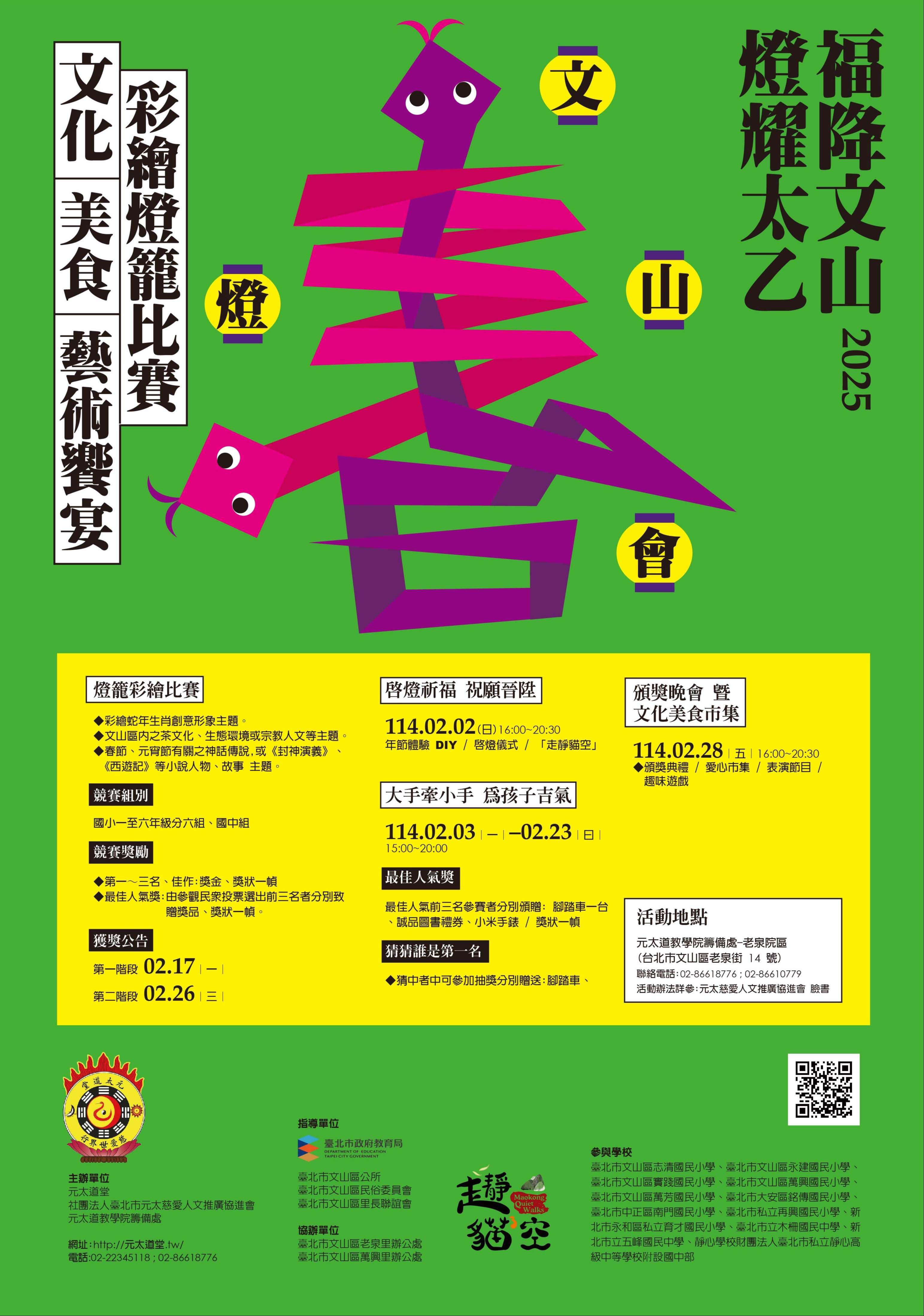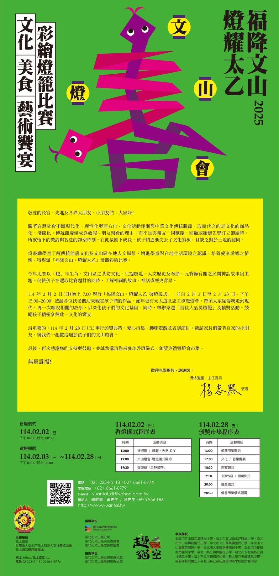社團法人臺北市元太慈愛人文推廣協進會辦理2025 「福降文山,燈耀太乙」燈會暨燈籠彩繪比賽海報及邀請 函各1份