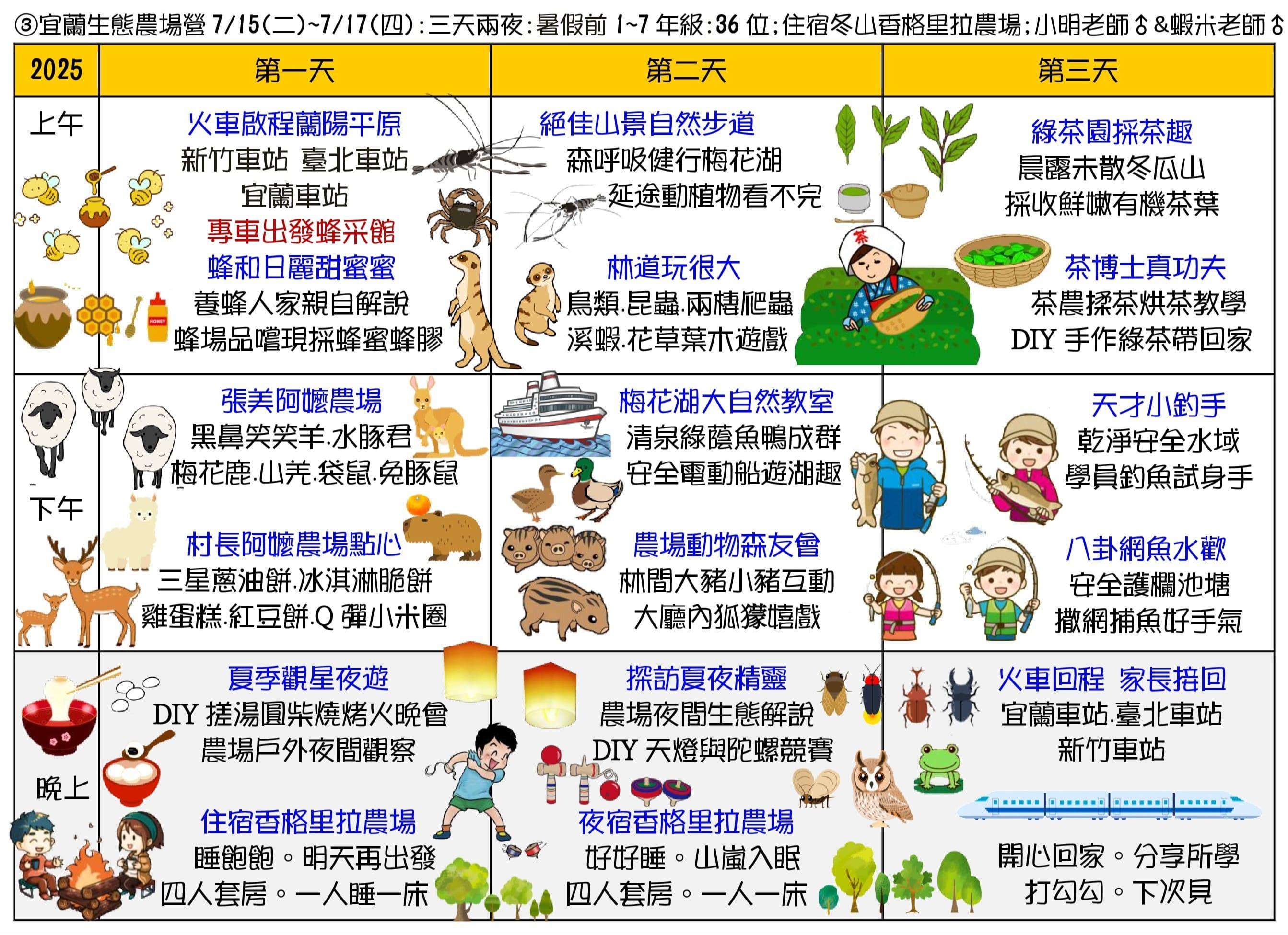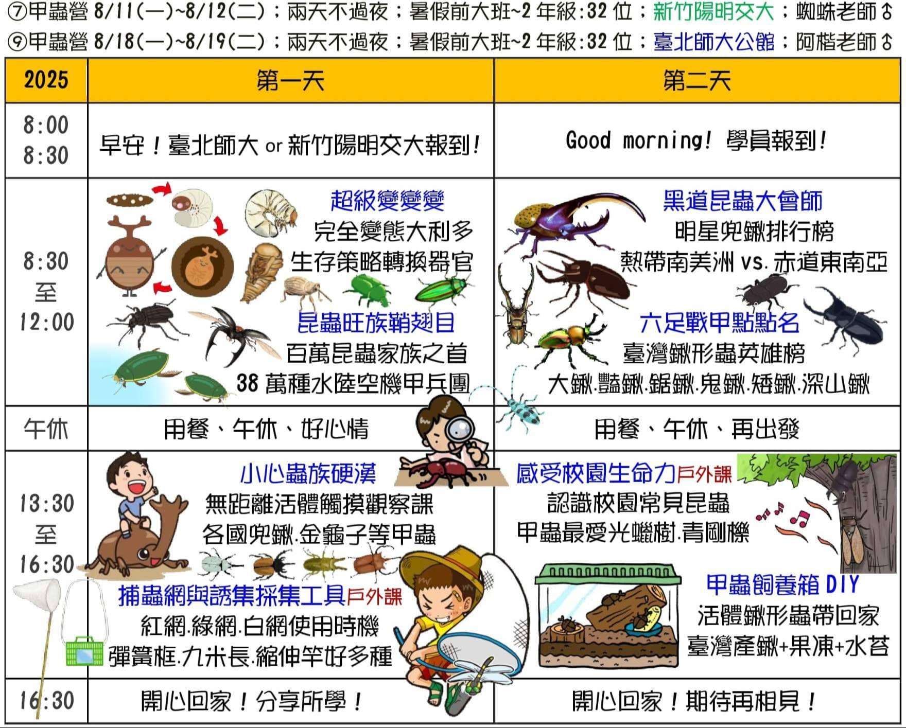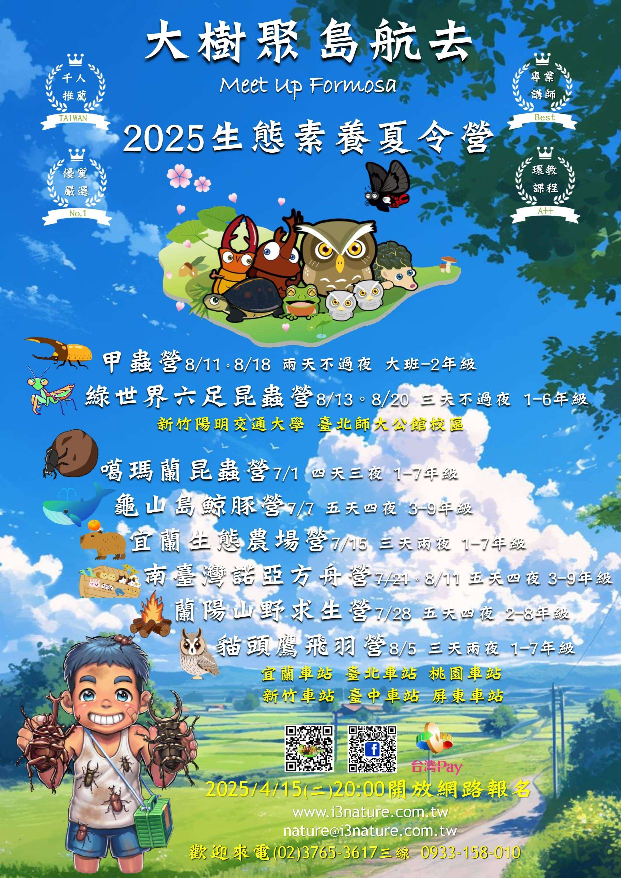 一、2025生態素養夏令營日期7/2~8/26,招生涵蓋大班-九年級 學員,請依不同課程分齡參加,詳細請見營隊網站 https://www.i3nature.com.tw/。
