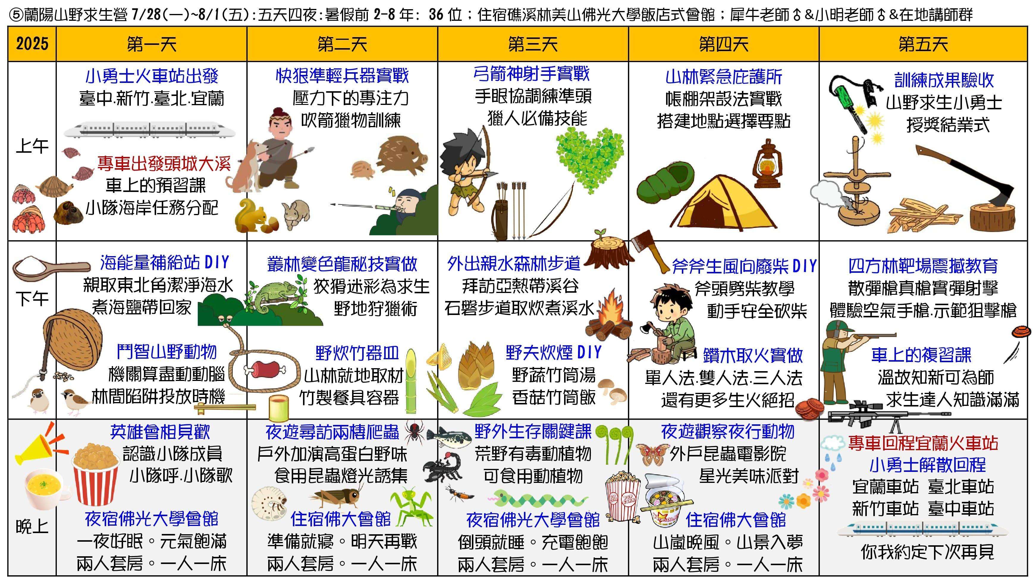 二、課程主題包括:①噶瑪蘭昆蟲營②龜山島鯨豚營③宜蘭生 態農場營④南臺灣諾亞方舟營⑤蘭陽山野求生營⑥貓頭鷹 飛羽營⑦甲蟲營⑧綠世界六足昆蟲營⑨滿月圓森林營⑩東 北角漁村營⑪池上單車營共十三梯次過夜與非過夜營隊。