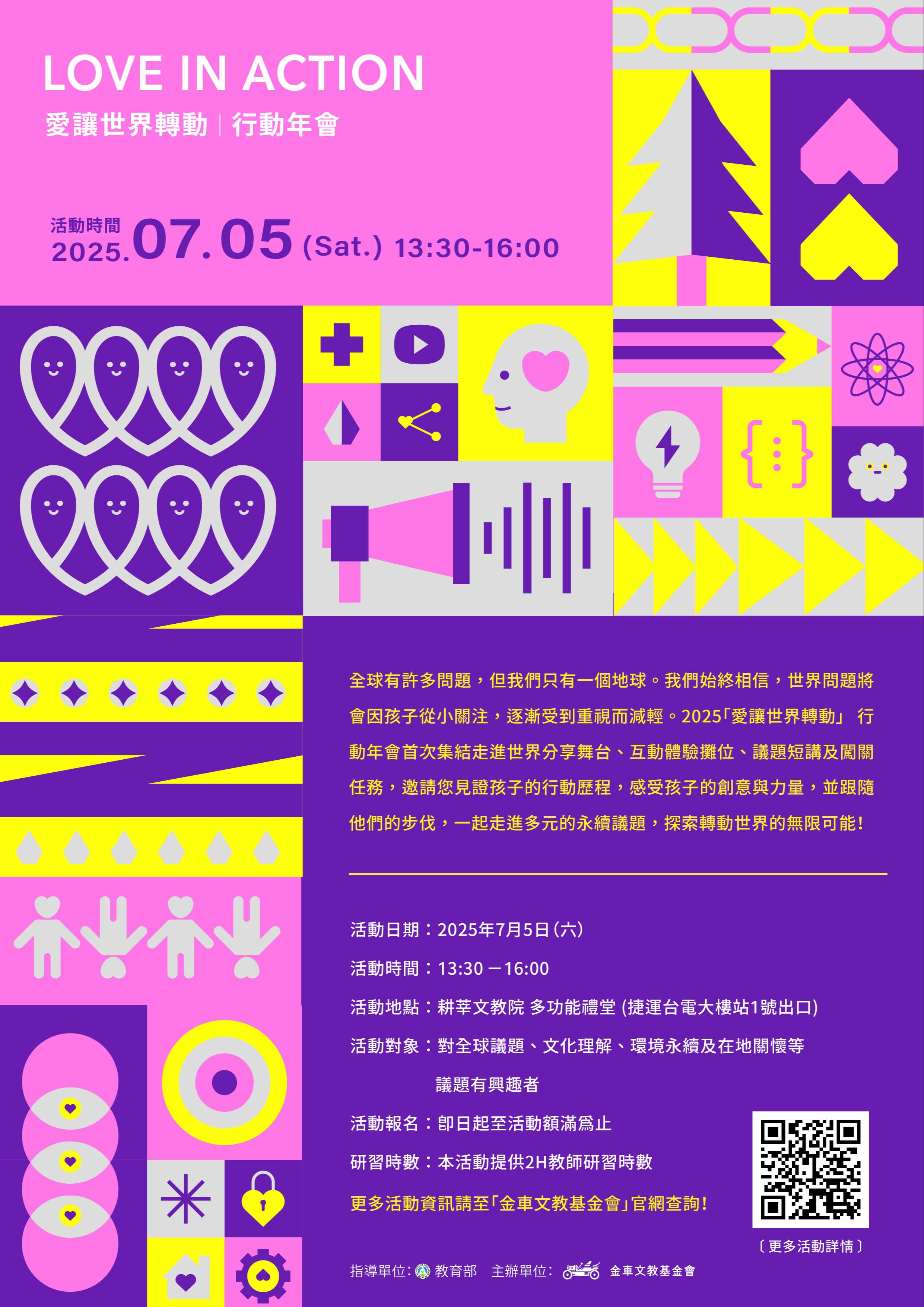一、金車文教基金會長期推動「愛讓世界轉動」計畫,鼓勵老 師陪伴孩子以國際視野、在地行動,走出教室落實社會關 懷。2025「愛讓世界轉動」行動年會活動特別集結獲獎團 隊師生行動成果,現場設有15個互動體驗攤位、4大議題專 家短講及闖關任務等豐富活動,教您如何透過教學設計與 課堂實踐,連結在地與國際重要的永續議題,打造有感的 學習氛圍,攜手孩子走進地方、邁向世界。