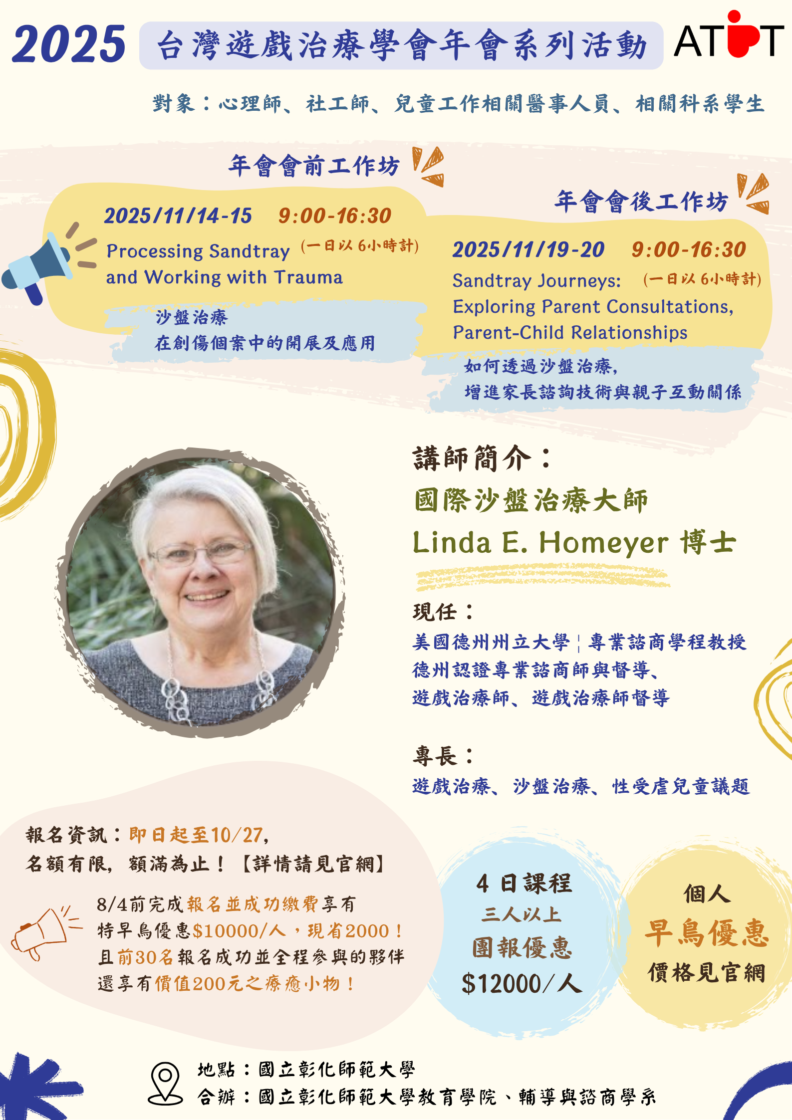 2、於08/04前完成報名並繳費者,享有特早鳥優惠價!前30名報名成功並全程參與者,享有價值200元療癒小物,詳情請參考學會報名網站(https://www.atpt.org.tw/course-id-212)。