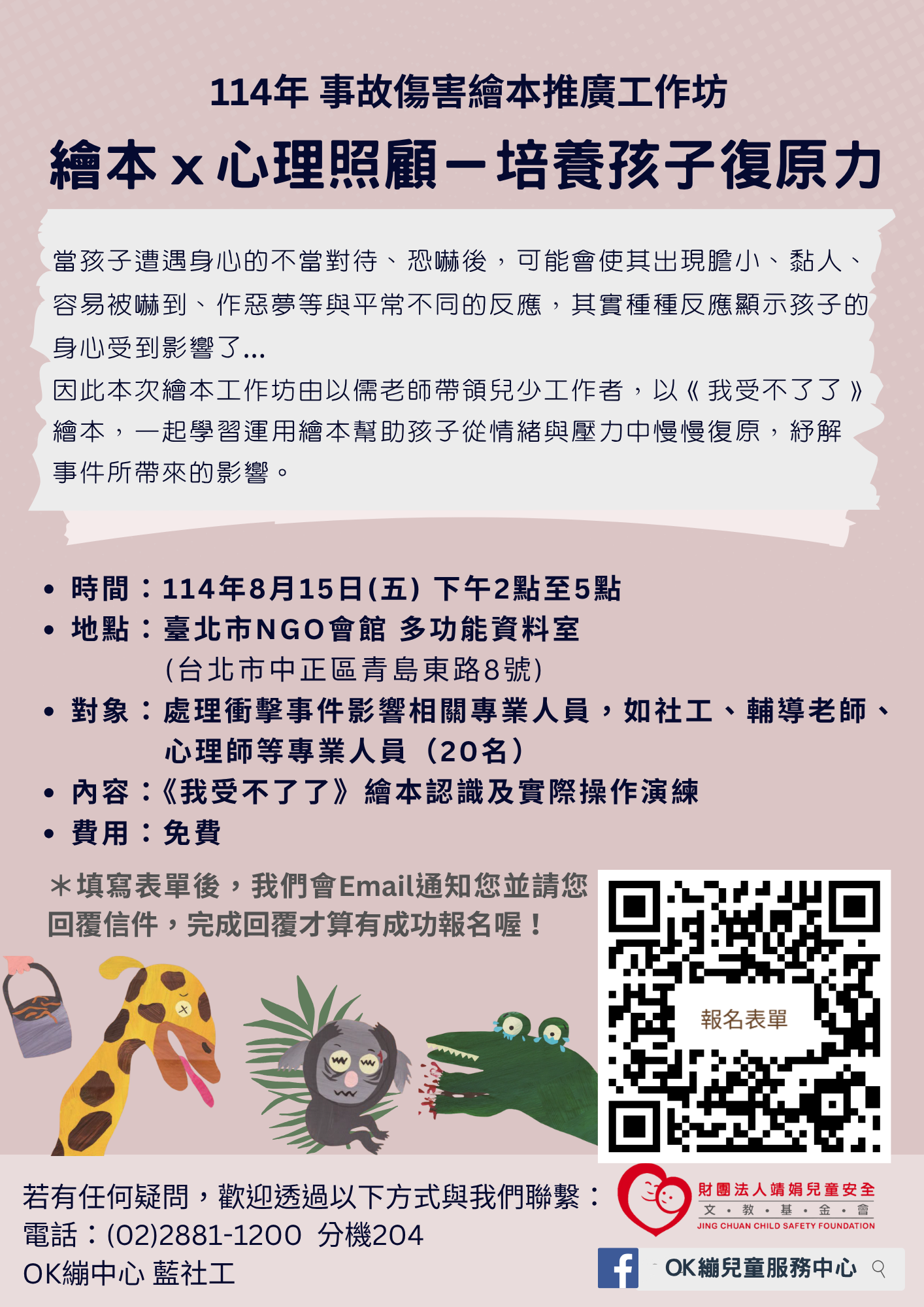旨揭工作坊以《我受不了了》繪本討論不當對待議題,讓相關專業人員能夠學習運用繪本,協助曾受不當對待經驗的孩子紓解情緒與衝擊,工作坊相關資訊請詳參附件宣傳單。