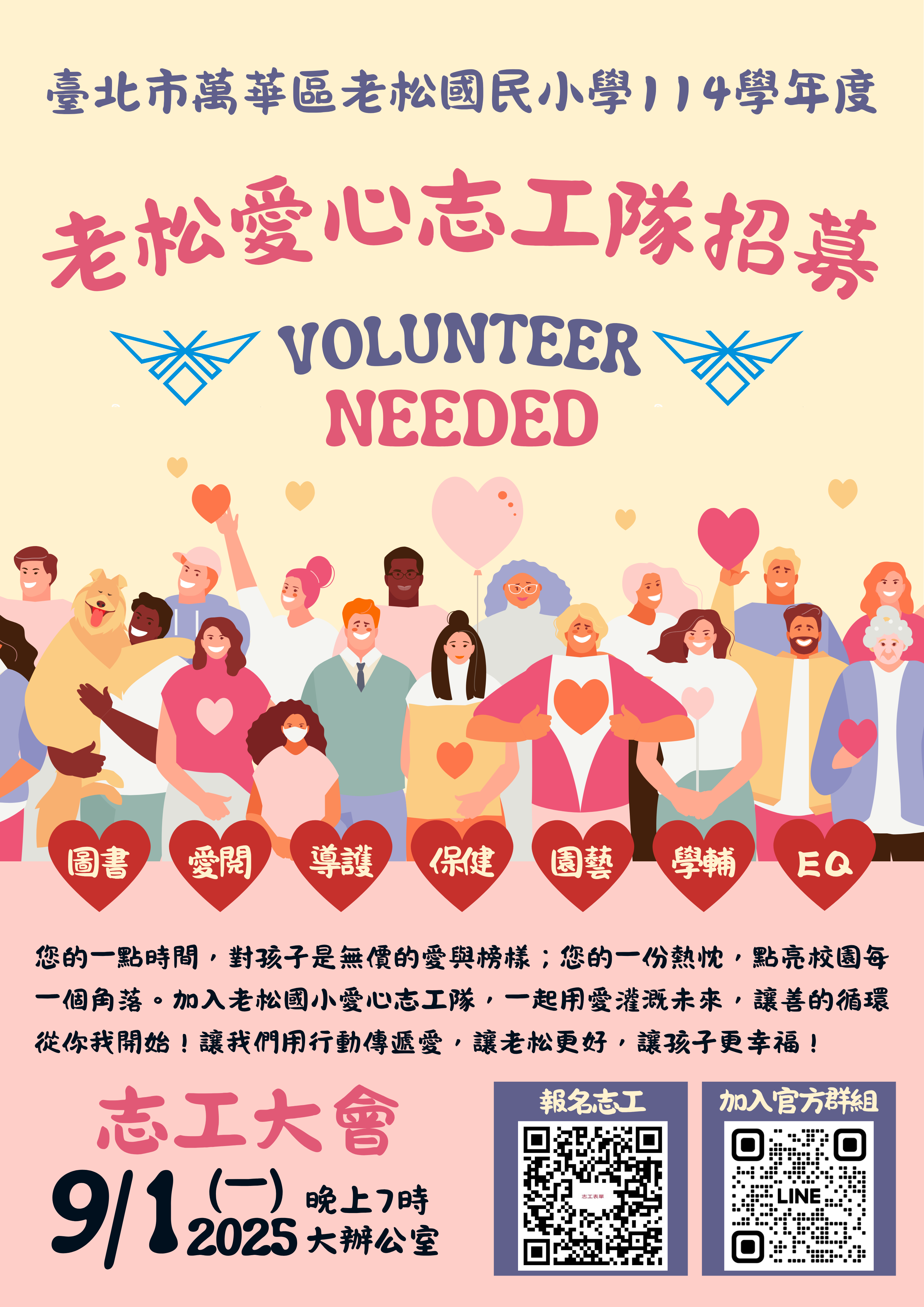 開學日9/1晚上七點,於老松國小大辦公室召開志工大會,歡迎您一起參與了解各組工作,認識同組夥伴加入各組LINE群喔!