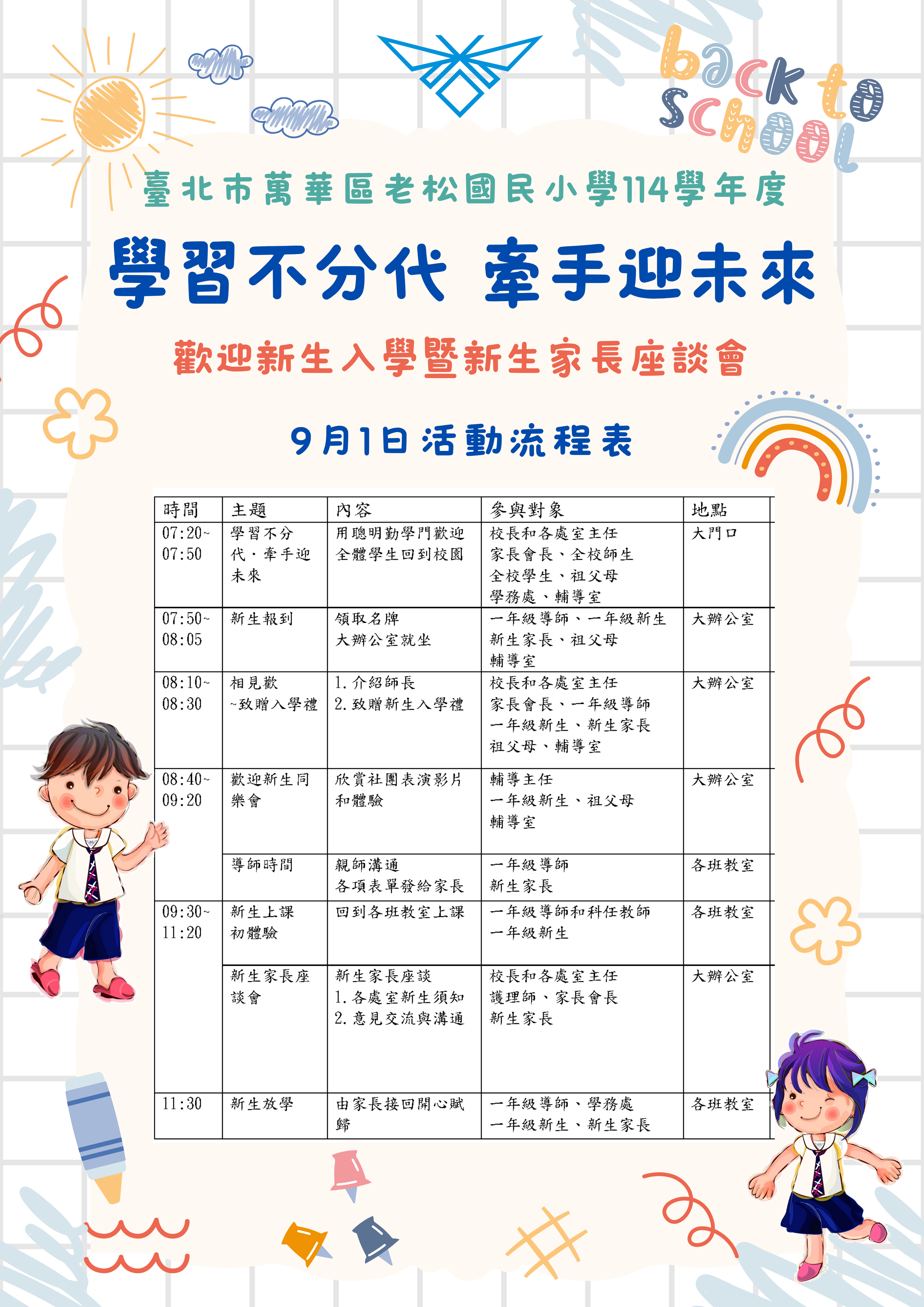 114年9月1日(一)上午7:20至12:00,老松國小將舉辦 「學習不分代.牽手迎未來」 活動,熱情迎接各位小可愛加入我們溫暖的大家庭!