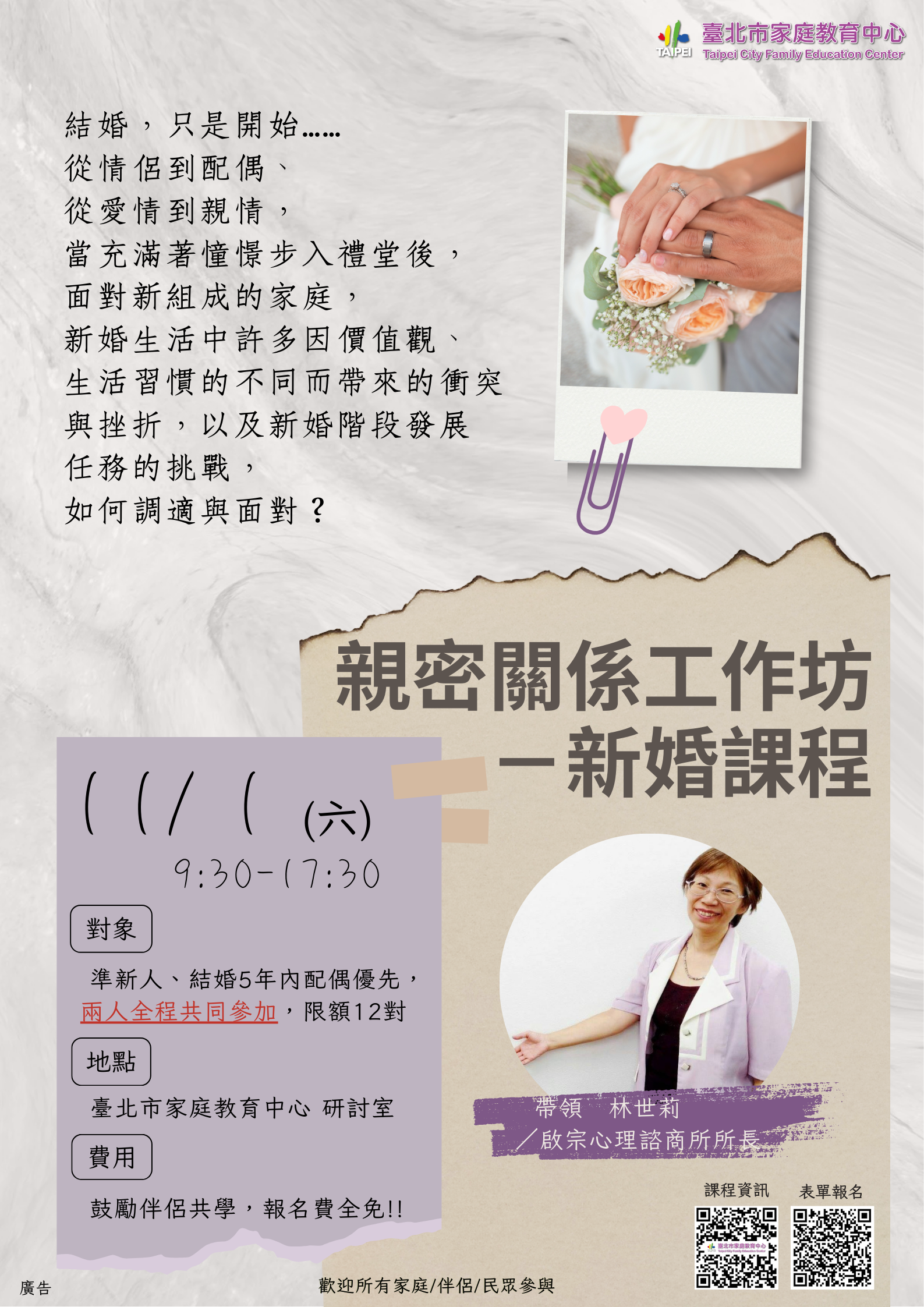 (四)報名:即日起至114年10月28日止,額滿採候補報名登記制,相關內容可於本中心網站(https://family.gov.taipei/Default.aspx)課程與活動瀏覽、下載。