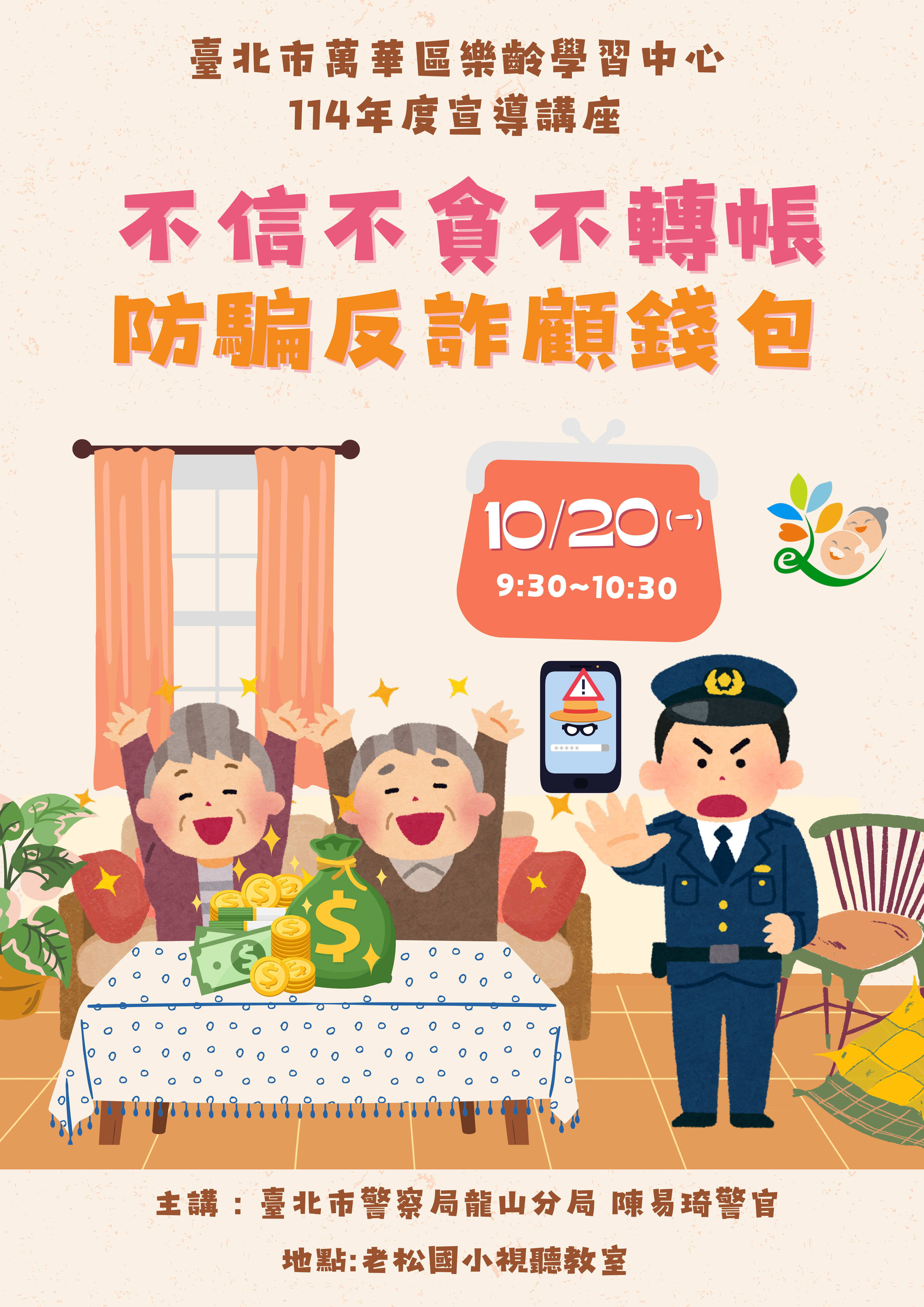 本場講座邀請到臺北市警察局龍山分局陳易琦警官,與我們探討時下最容易上當的詐騙方法,提供給大家防範於未然,保護自己也保護親愛的家人!