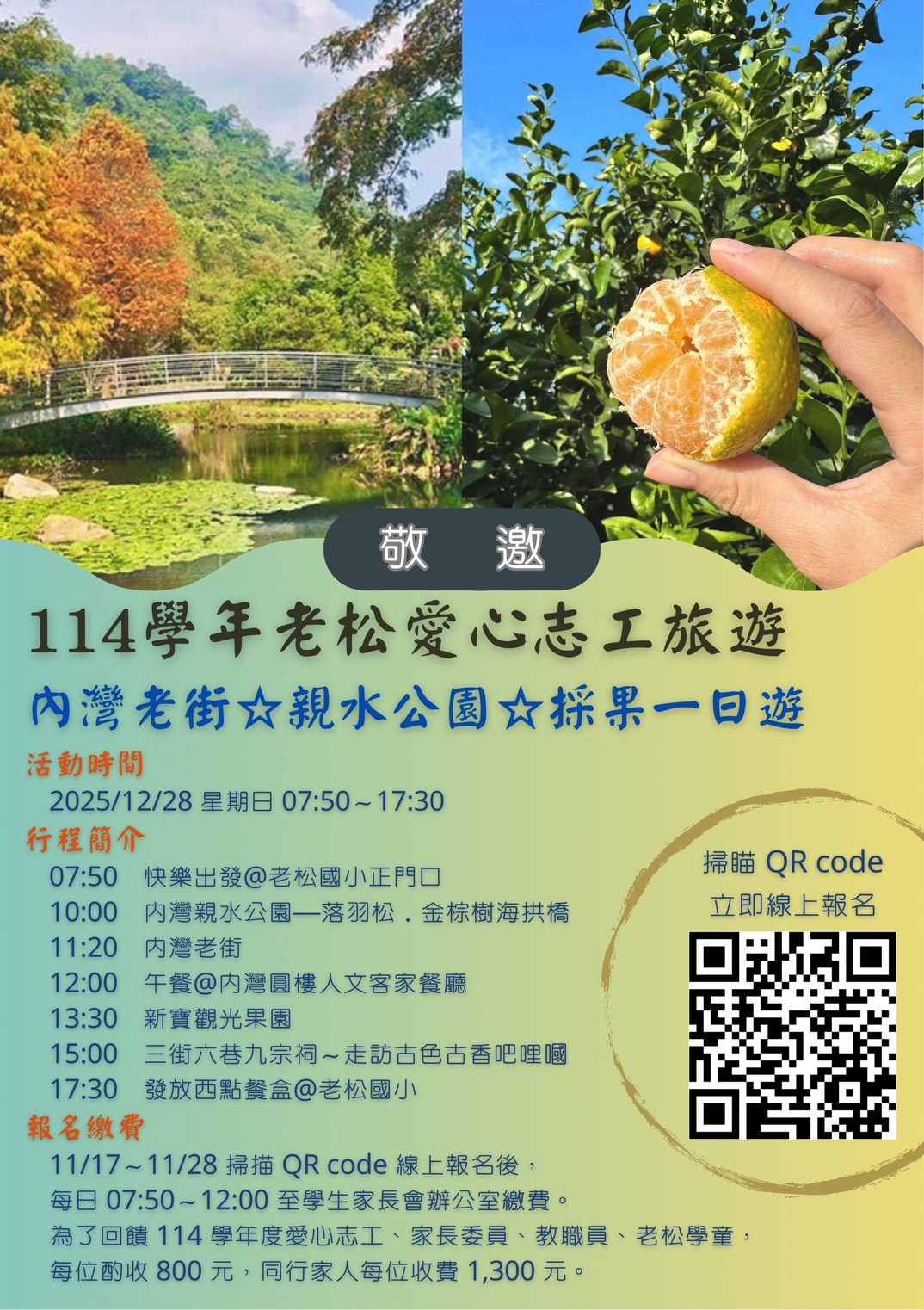 為了回饋 114 學年度的愛心志工、家委、教職員、老松學童和嬰幼童,每位僅酌收 800 元,其他同行家人每位收費 1,300 元。